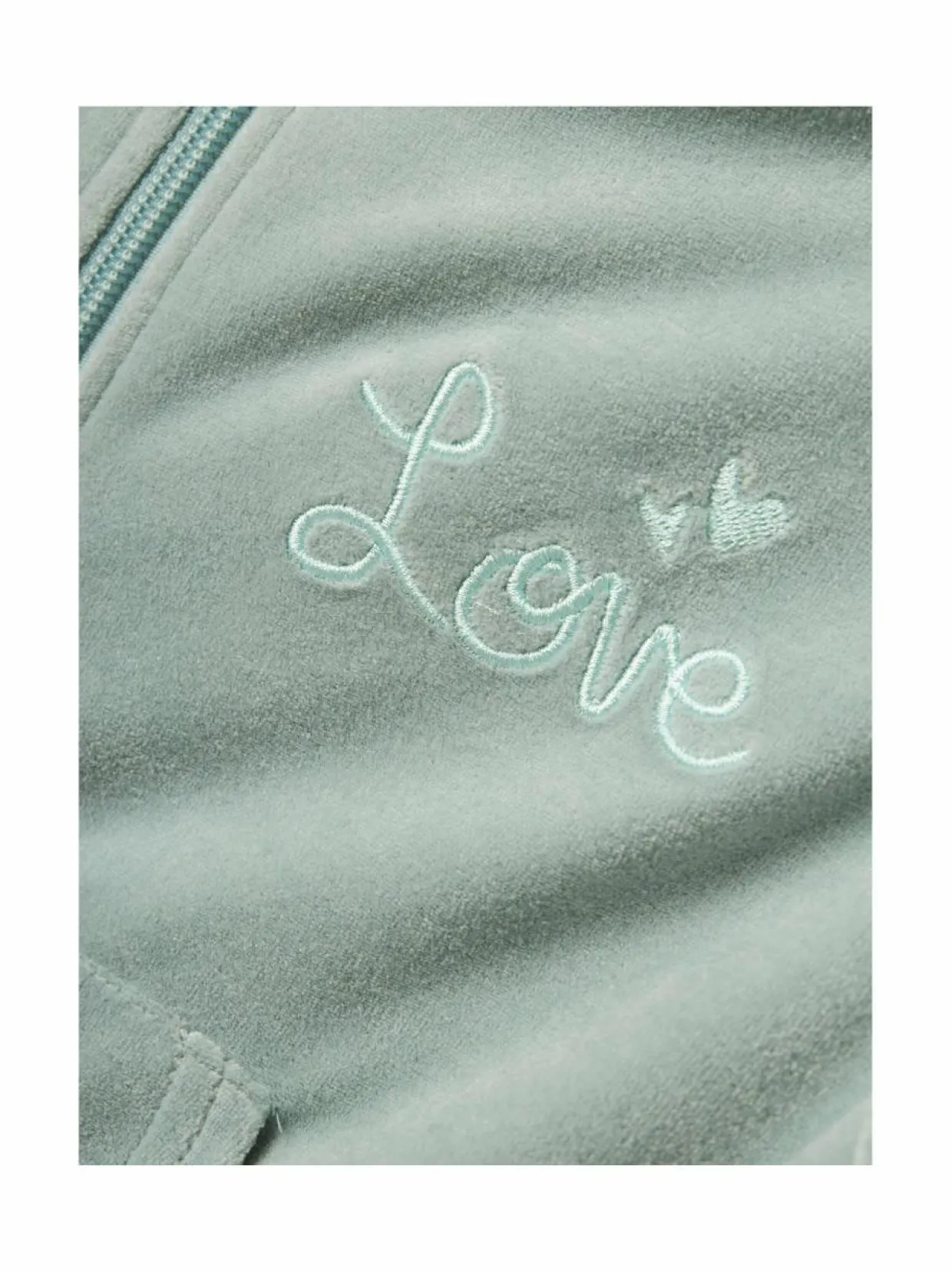 Lasten samettisen pehmeä hupparitakki tekstibrodeerauksella. Edessä on vetoketjusulku leukasuojalla sekä taskut. Samettihuppari on suunniteltu normaalilla istuvuudella.