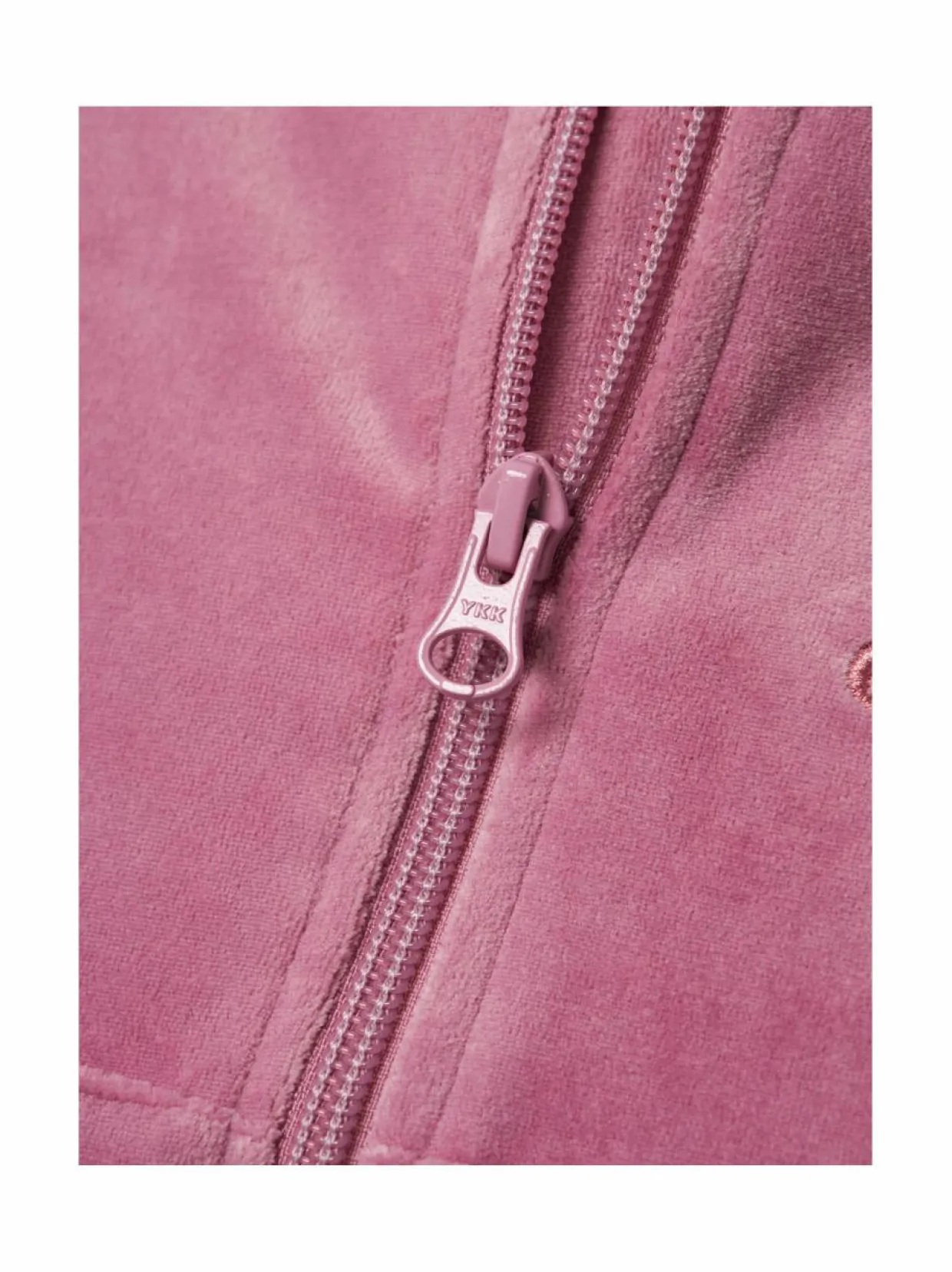 Lasten samettisen pehmeä hupparitakki tekstibrodeerauksella. Edessä on vetoketjusulku leukasuojalla sekä taskut. Samettihuppari on suunniteltu normaalilla istuvuudella.