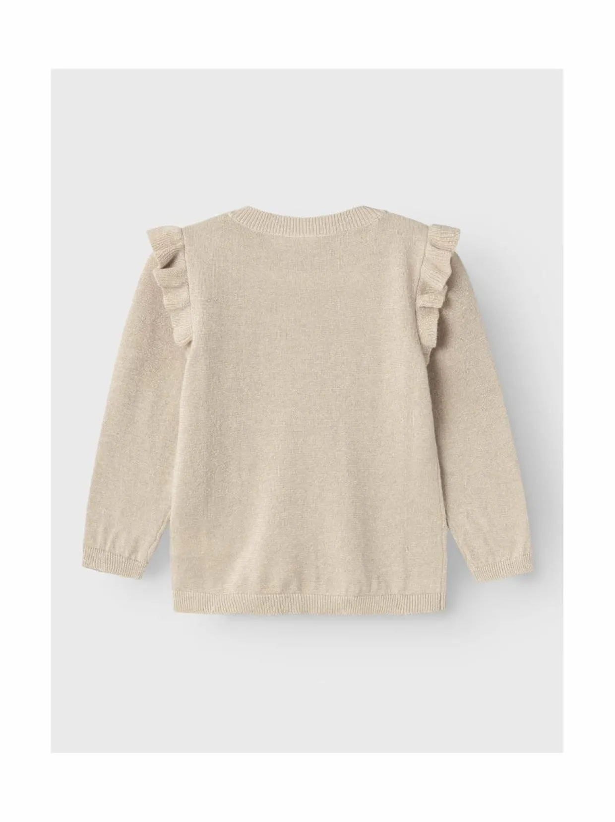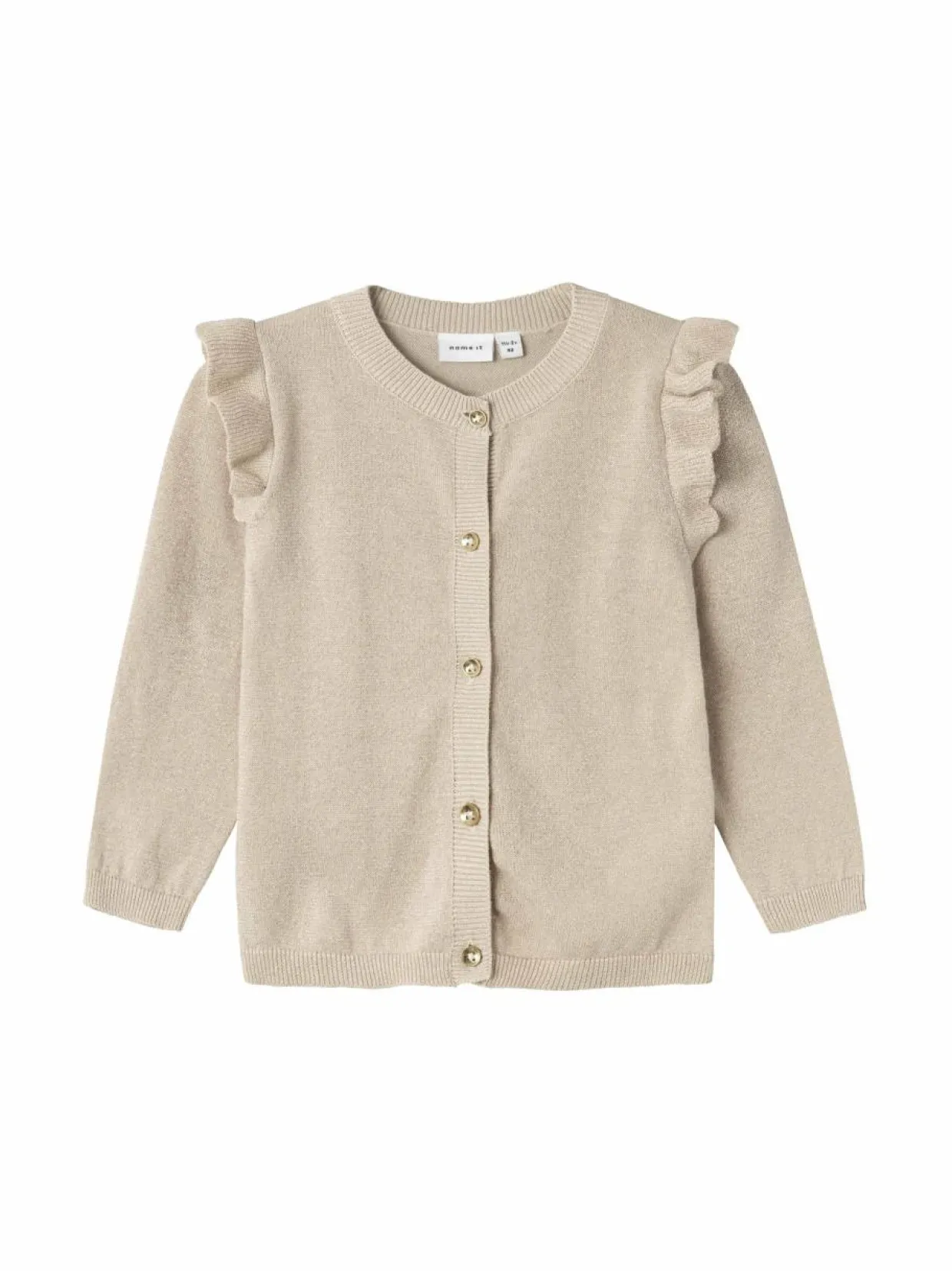 NAME IT -merkin kimalteleva neuletakki on pehmeää puuvillasekoitetta. Neuletakissa on pyöreä pääntie, pitkät hihat ja napitus edessä. Olkapäiden röyhelöt viimeistelevät suloisen ilmeen.
