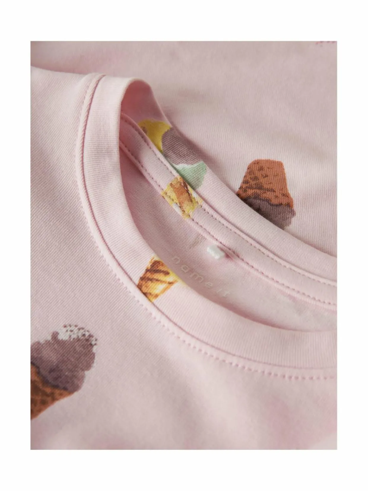 Mukava lyhythihainen t-paita aurinkoisiin kesäpäiviin. Paidassa on ihana jäätelökuosi ja frillahihat. Valmistettu pehmeästä ja hengittävästä luomupuuvillasta elastaanilla, joka lisää joustavuutta.