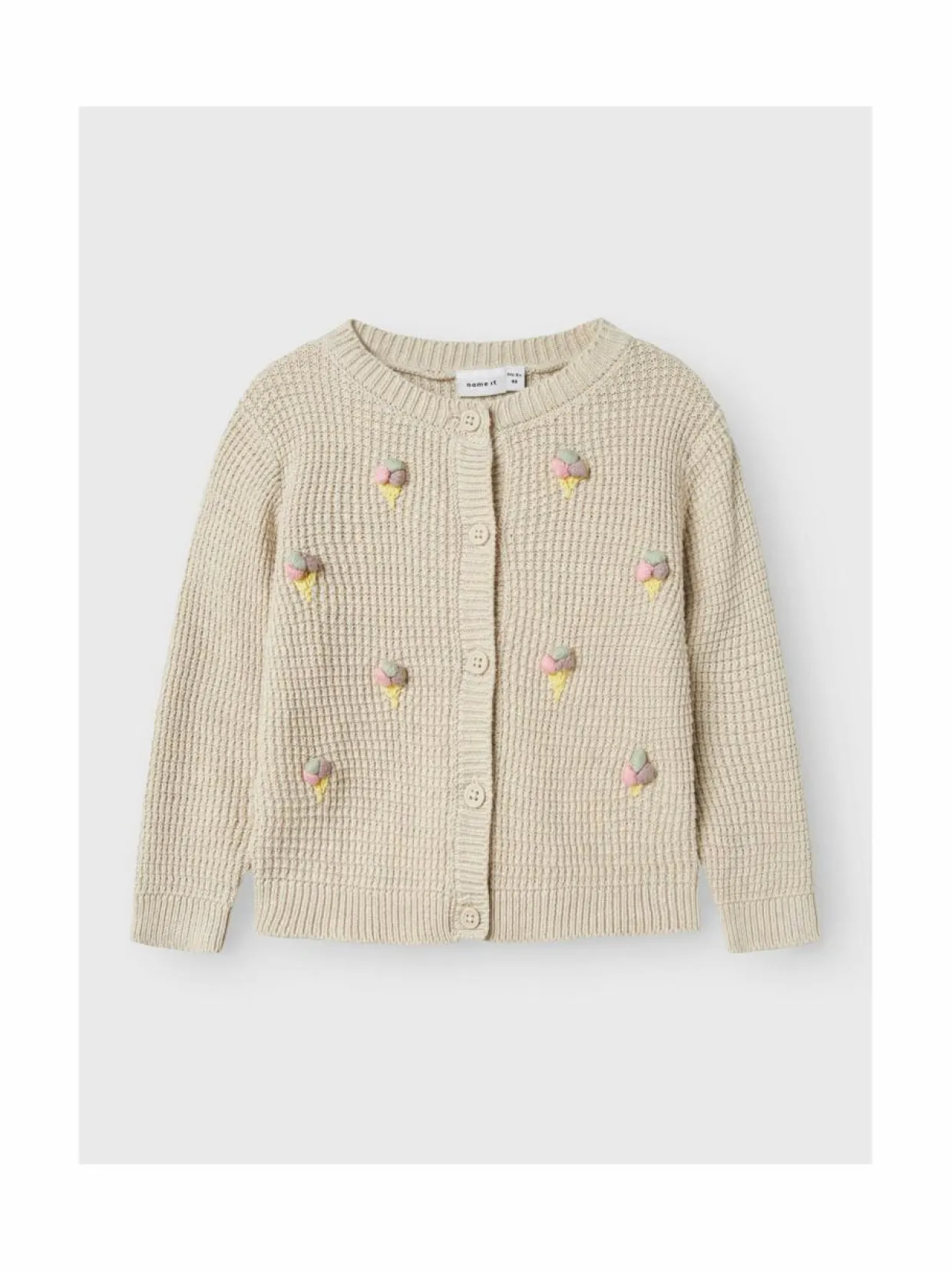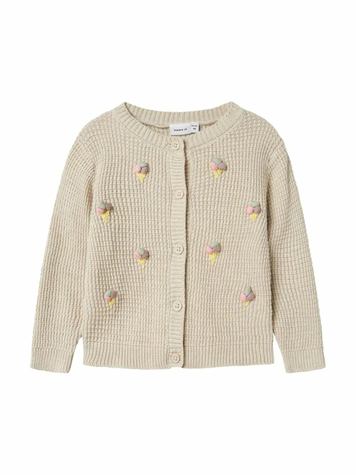 NAME IT -merkin neuletakki on valmistettu pehmeästä ja mukavasta puuvillasta. Neuleessa on ihanat jäätelöbrodeeraukset ja napitus edessä. Puuvilla on luonnollinen materiaali, joka hengittää hyvin ja on miellyttävä iholle. Se on myös kestävä materiaali, joka kestää useita pesuja.