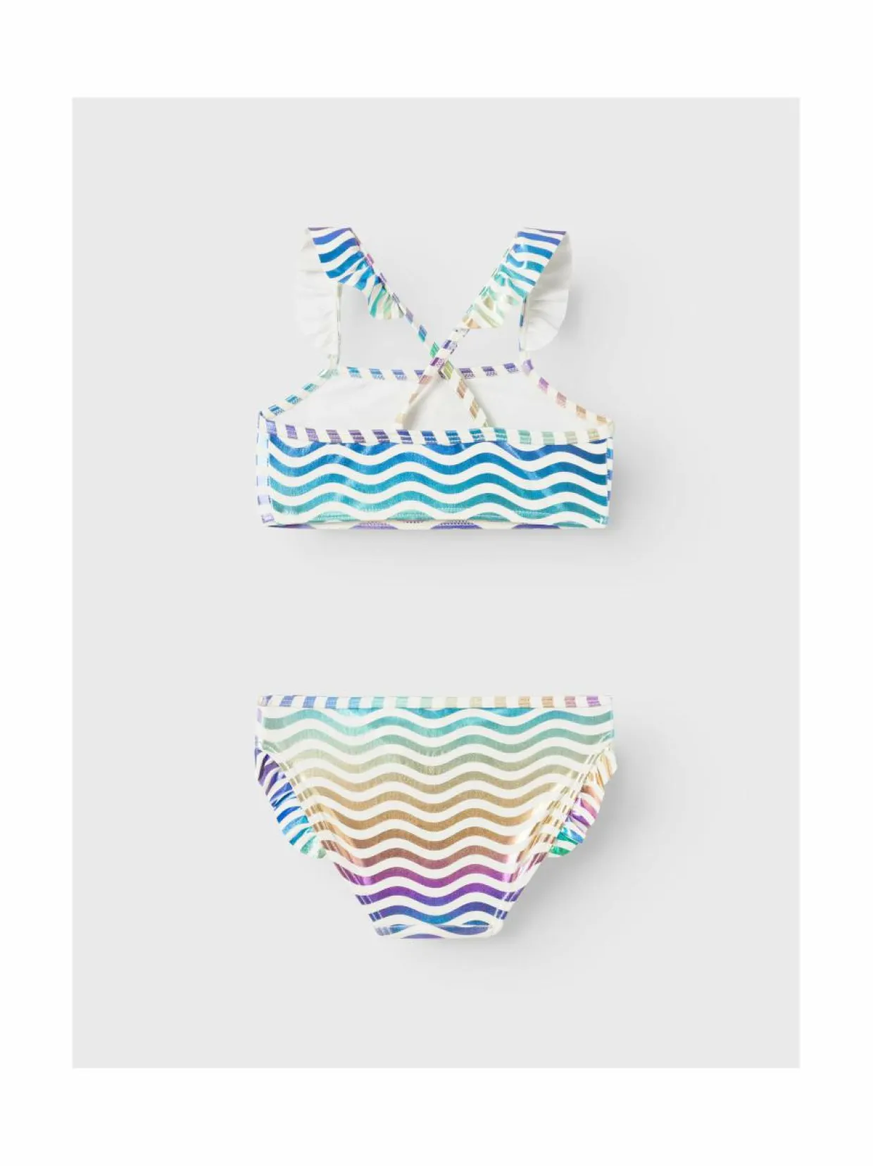 Setti, johon kuuluu bikiniylä- ja alaosa. Upeissa bikineissä on aaltoileva, metallinhohtoinen kuosi. Lisäksi bikineitä somistavat röyhelöt. Olkaimet asettuvat selässä ristiin.