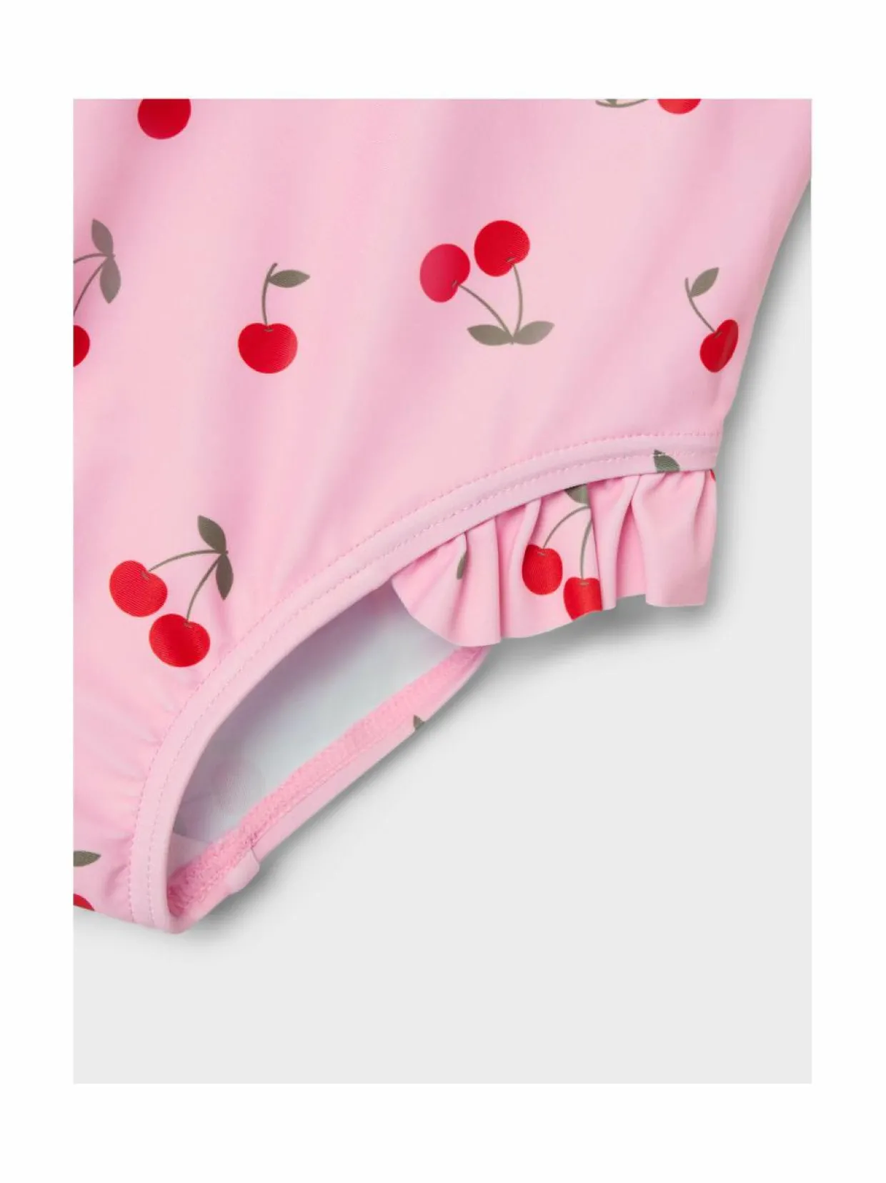 Lasten kuvioitu uimapuku on valmistettu pehmeästä ja joustavasta materiaalista. Uima-asu on varustettu leveillä olkaimilla ja röyhelöillä. Materiaali on kestävää kierrätettyä polyesteriä.