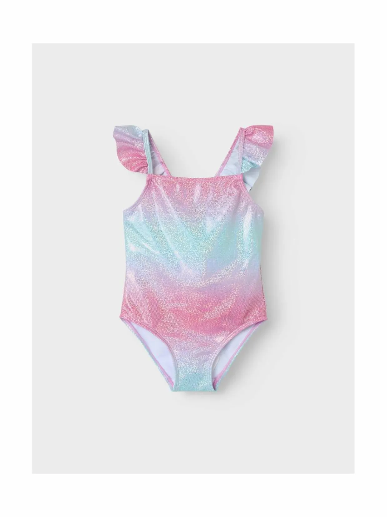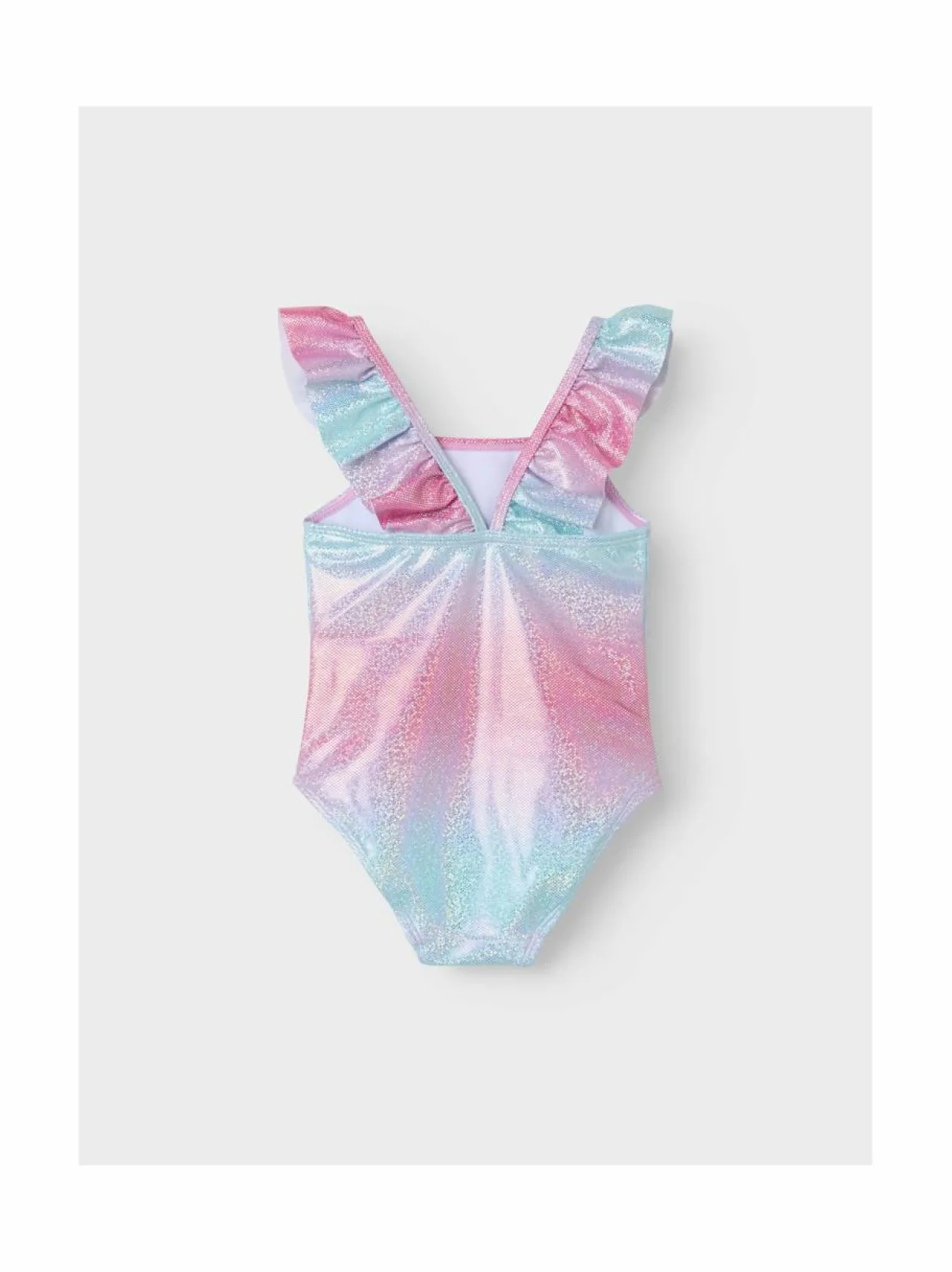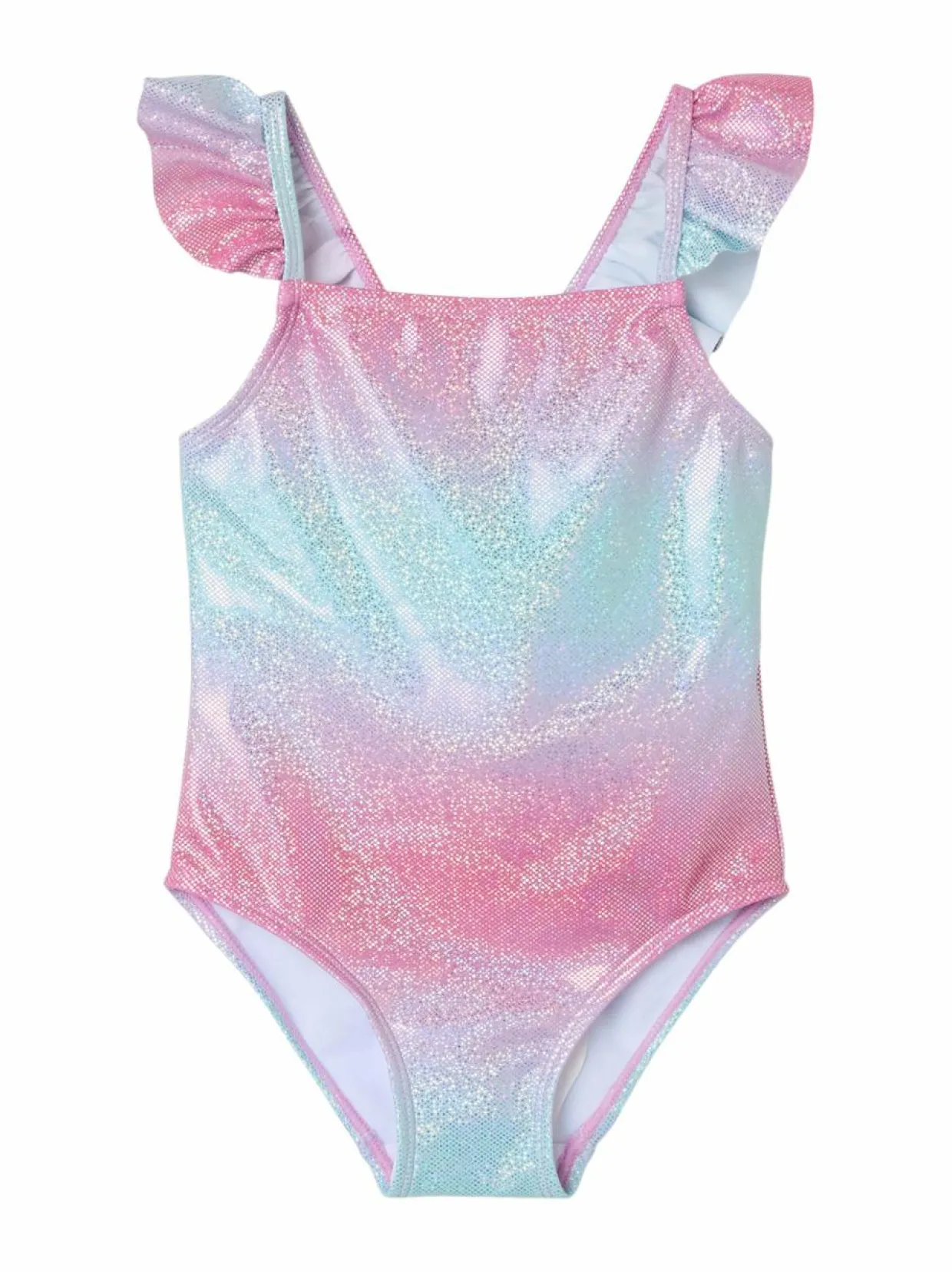 NmfZelma -värikäs ja kiiltävä uimapuku, jossa on kauniit röyhelöt olkaimissa. Se on valmistettu pehmeästä ja joustavasta materiaalista, joka on nopeasti kuivuva, kestävä ja helppohoitoinen.