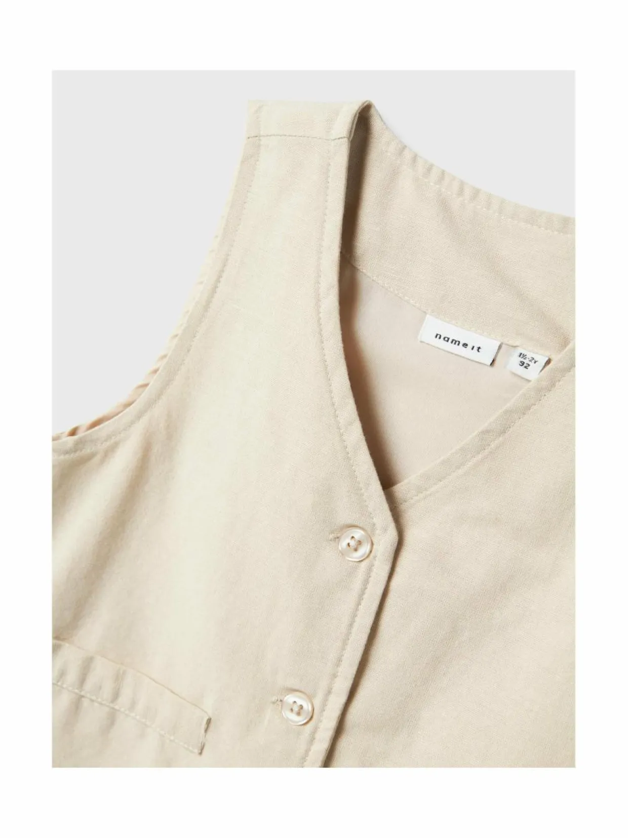 name it vaatemerkin lasten pukuliivi viimeistelee asukokonaisuuden tyylillä. Liivin edessä on kauniit helmiäisnapit ja taskut. Materiaalina on käytetty pehmeän tuntuista materiaaliyhdistelmää, josta löytyy niin Ecovero-viskoosia, puuvillaa kuin pellavaa.