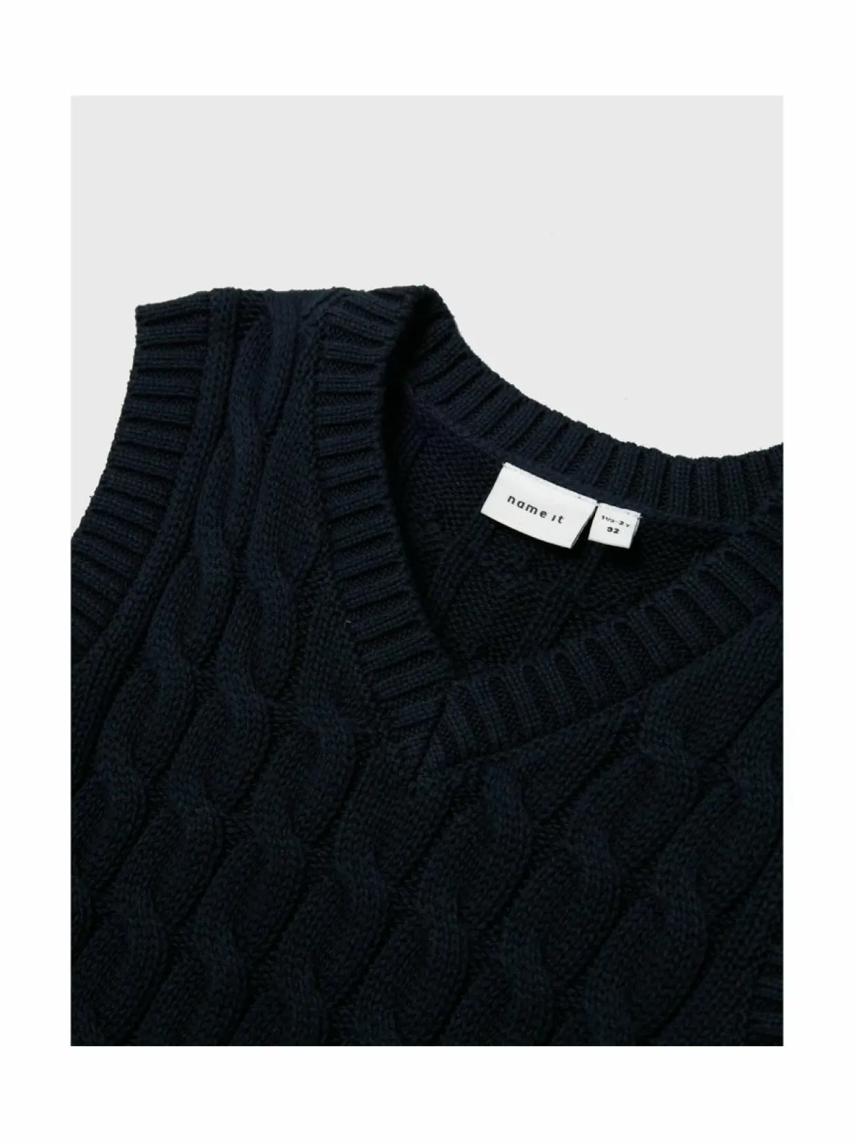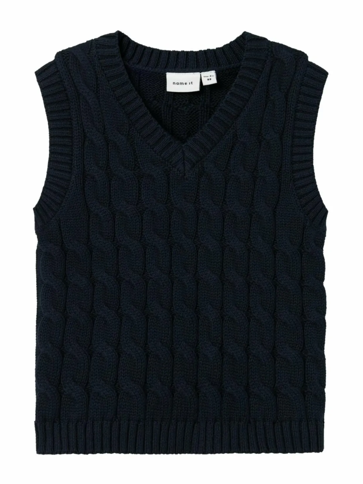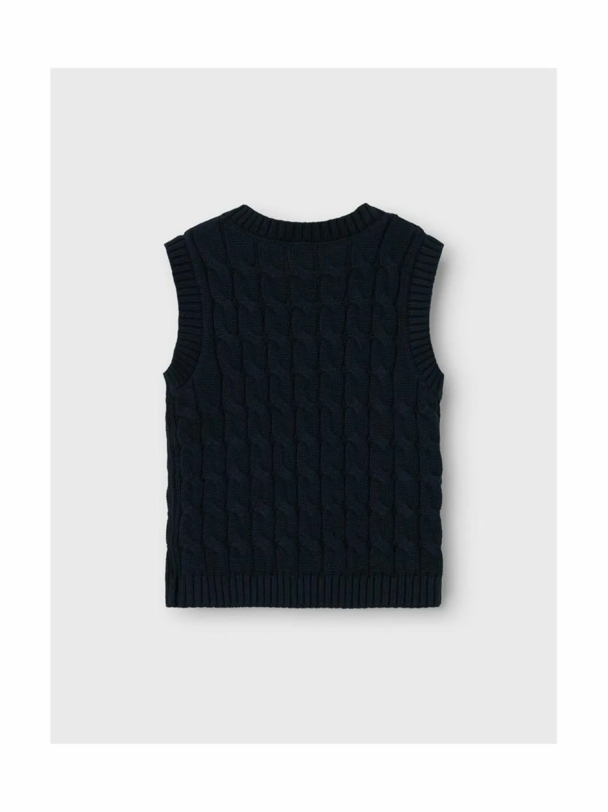 Name Itin NmmRemon on kaapelikuvioinen neuleliivi 100 % luomupuuvillalangasta. Mallissa on V-pääntie. Reunoilta löytyvät joustinneuleresorit.