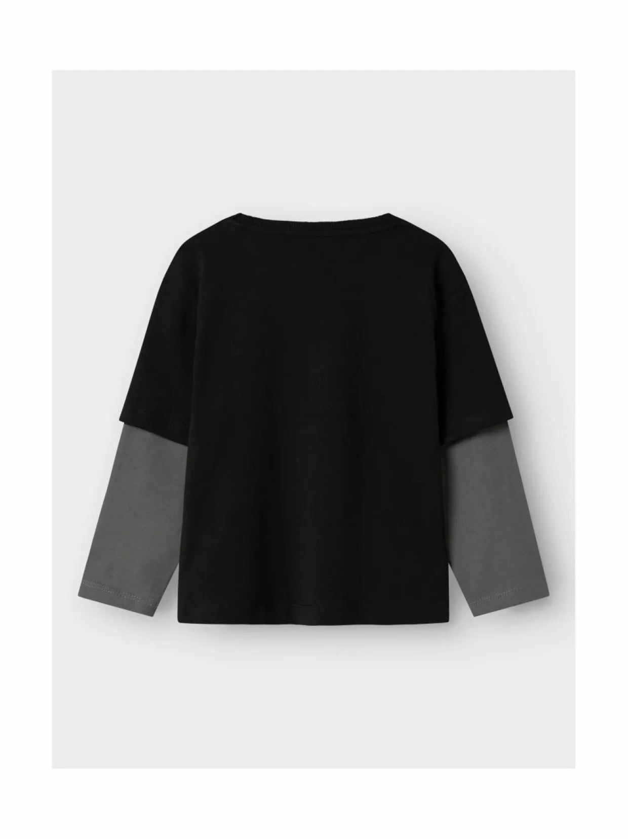 Lasten pitkähihainen paita luo kerrostetun ilmeen hihojen muotoilun ansiosta. Pääntiellä kulkee pehmeä resori. Edessä painatus. Tässä paitamallissa on suoralinjainen normaali istuvuus.