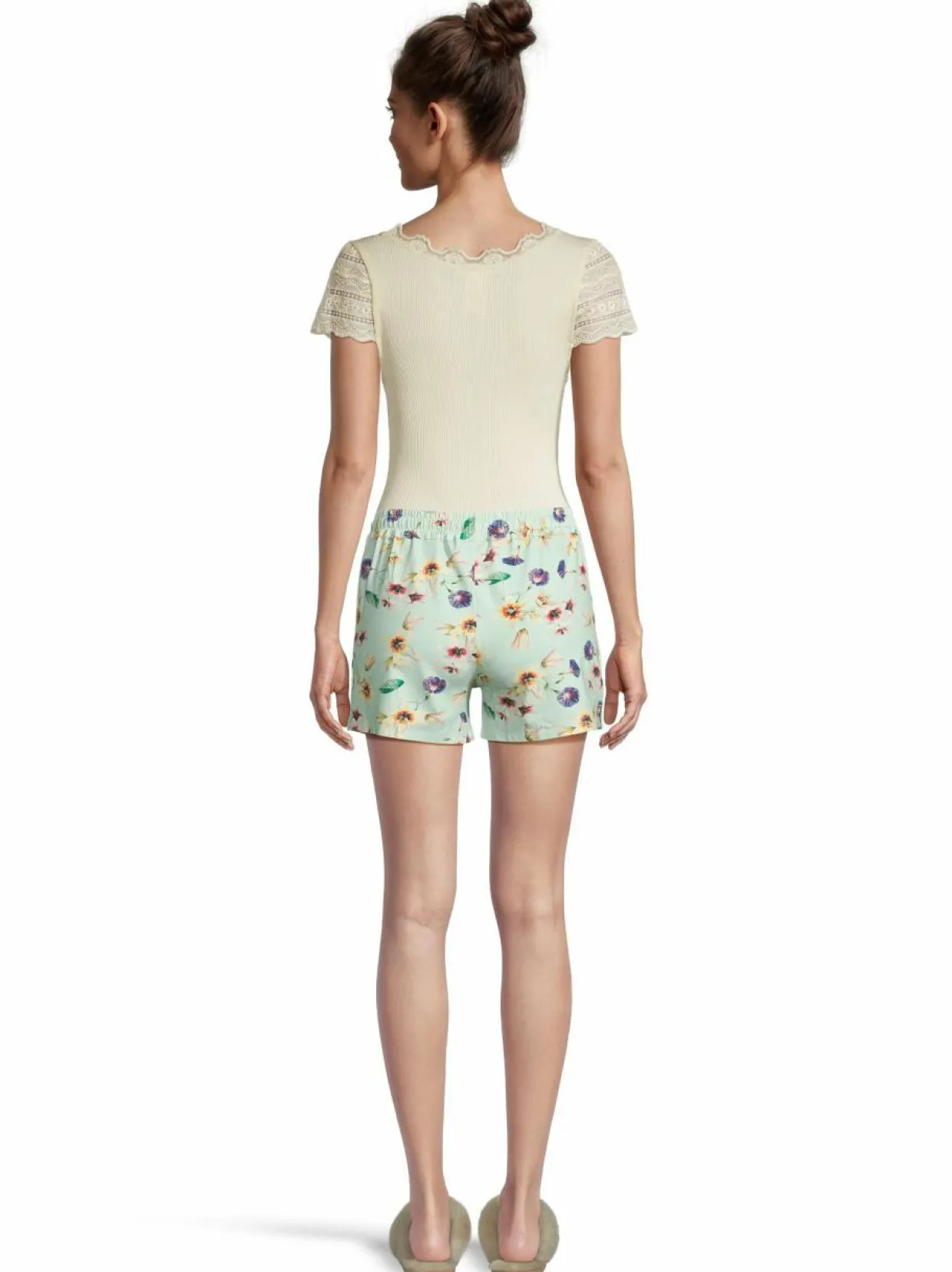 Materiaali96 % viskoosi, 4 % elastaani Hoito-ohjeetPesu 30 asteessa, rumpukuivaus kielletty, silitys kielletty. Pesulämpötila30 °C ValmistusmaaTurkki VäriSUBTLE GREEN Avainsanatshortsit, yöasu, oloasu, Essenza, kukkakuvio, viskoosi, pyjamashortsit, yöshortsit