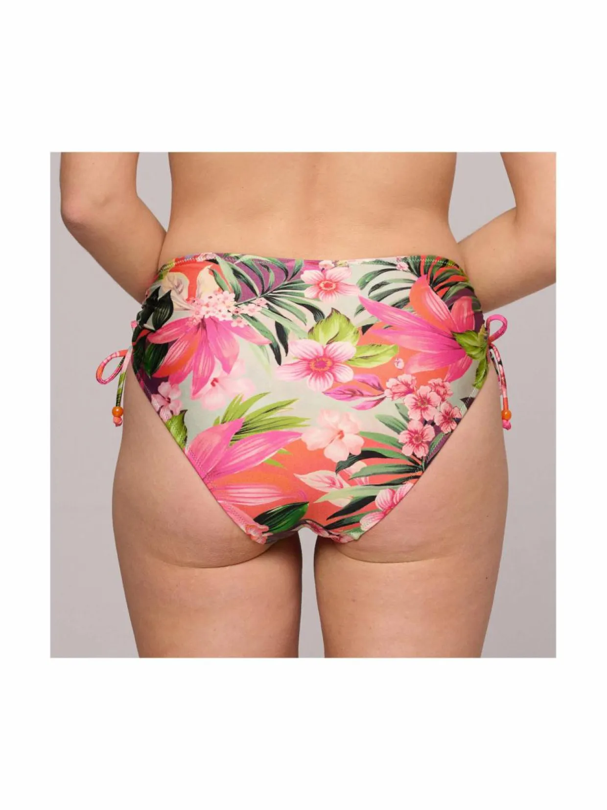Trooppisella kuosilla koristeltu korkeavyötäröinen bikinialaosa Marie Jo merkiltä. Bikinihousujen sivuissa on kiritysmahdollisuus. Kangas on joustava sekä nopeasti kuivuva.