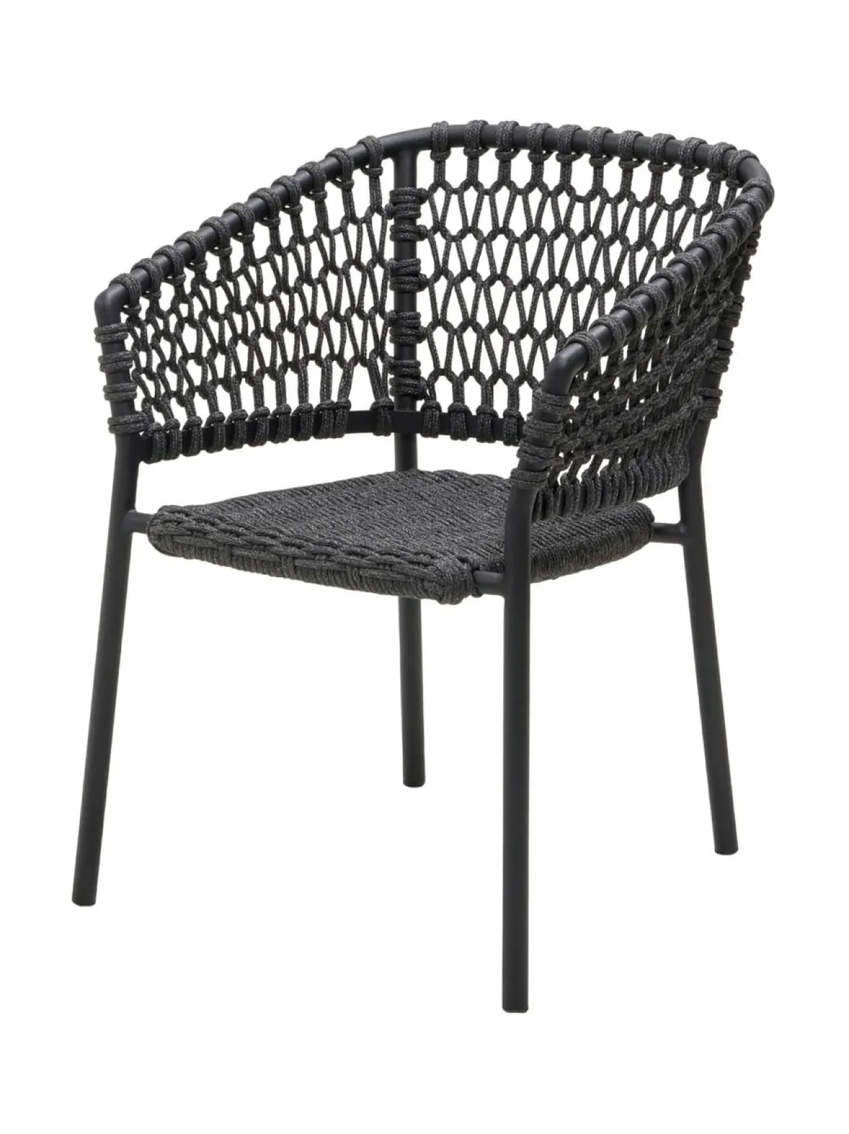 Pinottava Ocean-tuoli ulkokäyttöön. 57 cm lev, 60 syv, 76 kork, 42 istuinkork. Istuintyynyt sisältyvät hintaan, harmaa Cane-line Natté. Alumiinirunko, tummanharmaa Cane-line Soft Rope -punos.