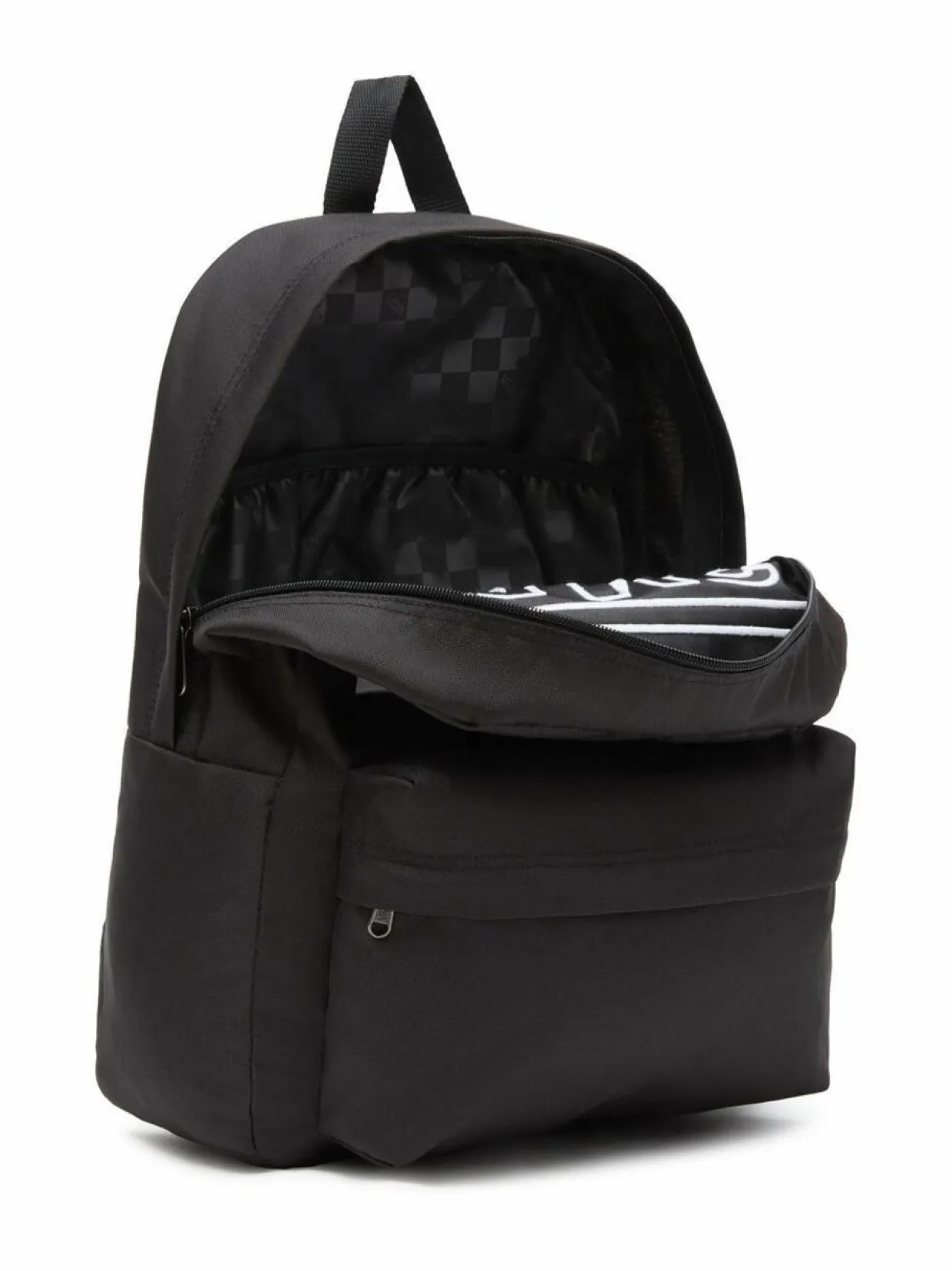 Vans Old Skool Drop V -reppu on valmistettu 100 % kierrätetystä polyesteristä. Repussa on kantokahva, pehmustetut olkaimet, yksi suuri päätasku, etuosio vetoketjulla sekä sivutasku juomapullolle. Sisäpuolella on myös pehmustettu läppäritasku, johon mahtuvat useimmat 38 cm kannettavat tietokoneet. Reppu on koristeltu Vans-logolla edessä.