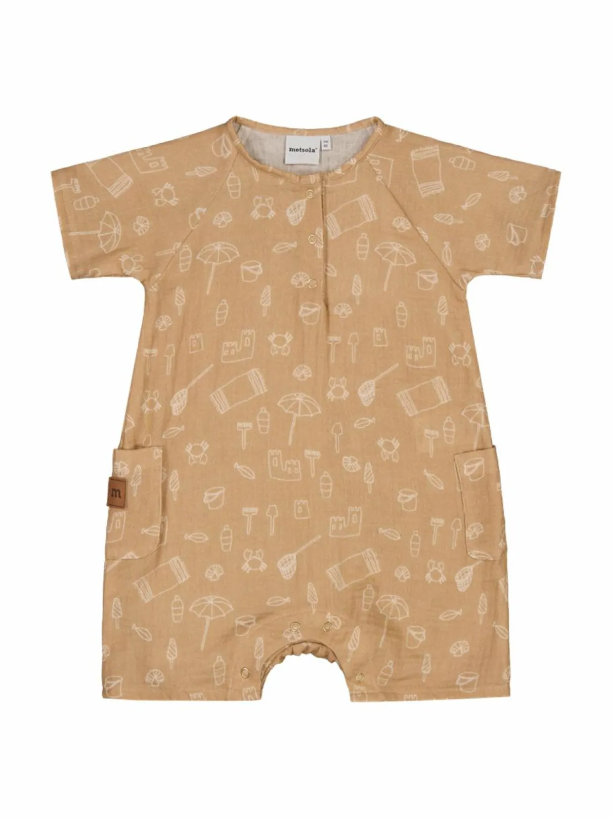Metsolan kesäiset musliinikankaiset haalarit on valmistettu 100 % puuvillasta. Haalarissa on hauska rannalle sopiva kuosi, jossa on mm. jäätelöitä, hiekkalinnan rakennusvälineitä ja muita kesäisiä elementtejä. Pehmeä ja hengittävä musliinikangas on täydellinen valinta lämpimiin kesäpäiviin. Haalari on varustettu kätevillä neppareilla ja sivutaskulla, ja se on suunniteltu pitämään pienet jalat mukavina ja tyylikkäinä.