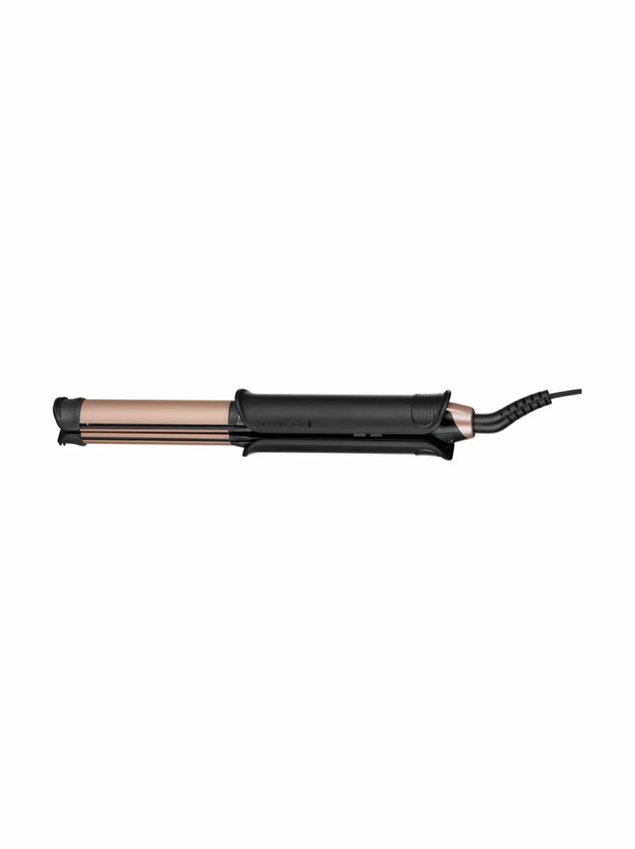 - Kiharrustila – 32 mm:n sauvakiharrinosa Kiharrustilassa voit käyttää kiharrin/suoristaja-lukkoa suoristusraudan lämpölevyjen yhteenlukitsemiseen ja muuttaa muotoilijasi pyöreäksi kihartimeksi. Läpimitaltaan perinteistä sauvakiharrinta suuremman kiharrinosan avulla on mahdollista muotoilla upeat lainekiharat.
