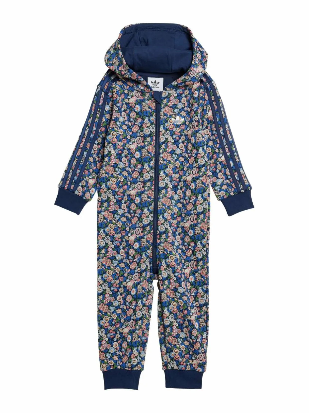 adidas Originals x Liberty London yhteistyöprojekti. Klassinen collegepuku perheen pienimmille ihasuttavassa kukkakuosissa. Collegehaalarin edessä on vetoketju leukasuojalla. Ikoniset kolmiraidat lisäävät vaatteelle sporttista ilmettä.