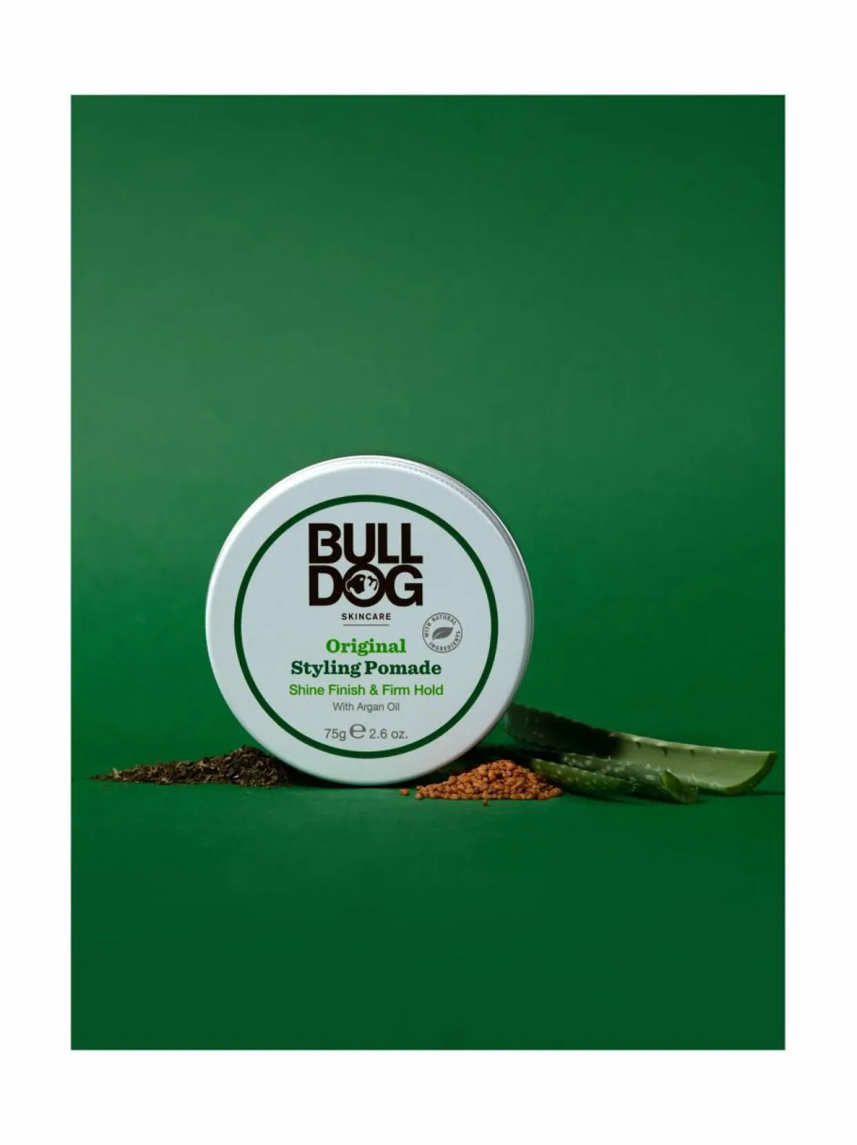Bulldog Original Styling Pomade sopii kaikille hiustyypeille ja antaa luonnollista kiiltoa sekä voimakkaan pidon. Tuote on vegaaninen, 92,5 % sisällöstä on luonnollista alkuperää, muun muassa luonnolliset muotoiluaineet kandelilla- ja karnaubavaha. Pomada sisältää myös vastuullisesti tuotettua ja täysin jäljitettävissä olevaa argaaniöljyä, joka antaa luonnollisen kiillon ja pehmeyden vaikeasti käsiteltäviin hiuksiin.
