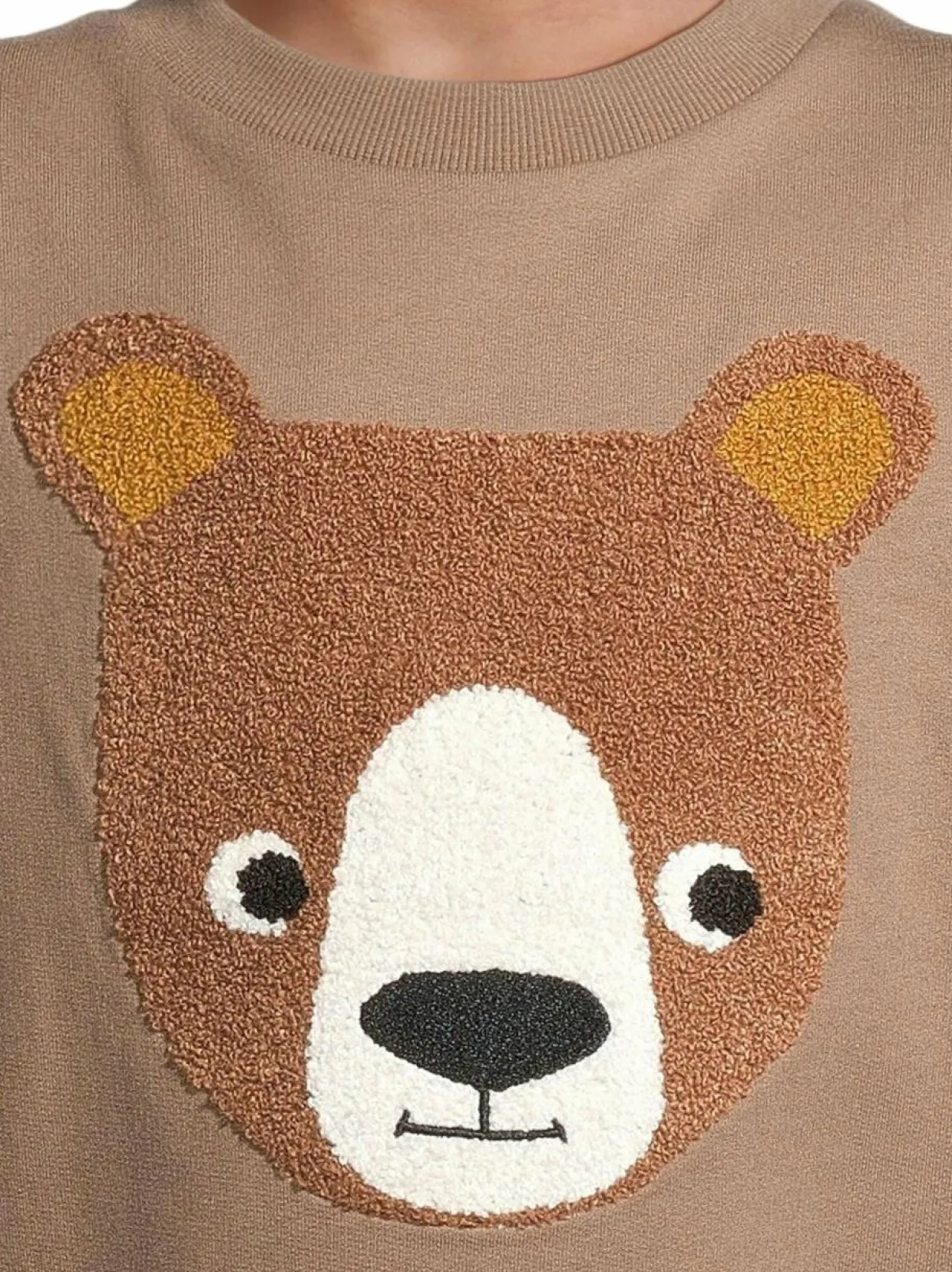 Lasten collegepaita pörröisellä karhuhahmolla. Joustoresorit kulkevat pääntiellä, helmassa ja hihansuissa. Sisäpuoli on pehmeäksi harjattua fleeceä. Materiaalina on käytetty ihoystävällistä luomupuuvillaa.