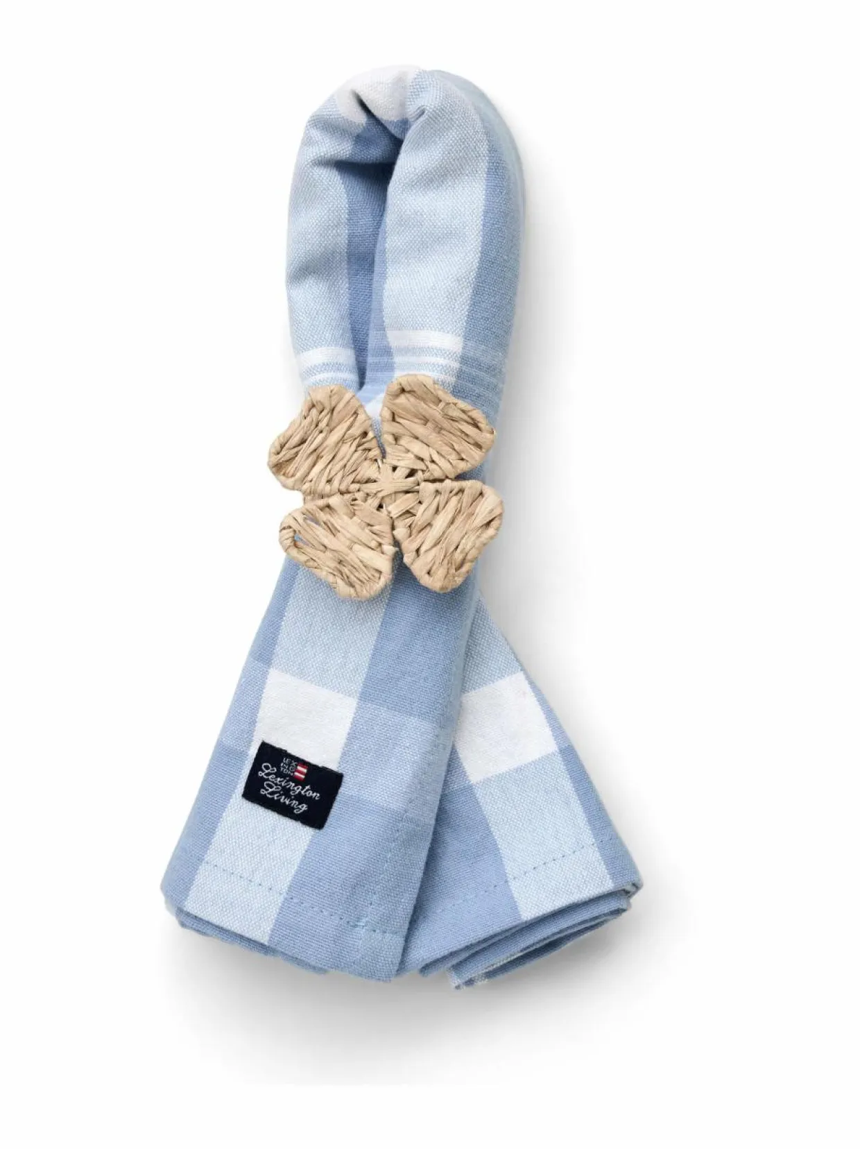 Lexingtonin Oxford -lautasliina on valmistettu kierrätetystä puuvillasta. Taitettu päärme ja logomerkki kulmassa.