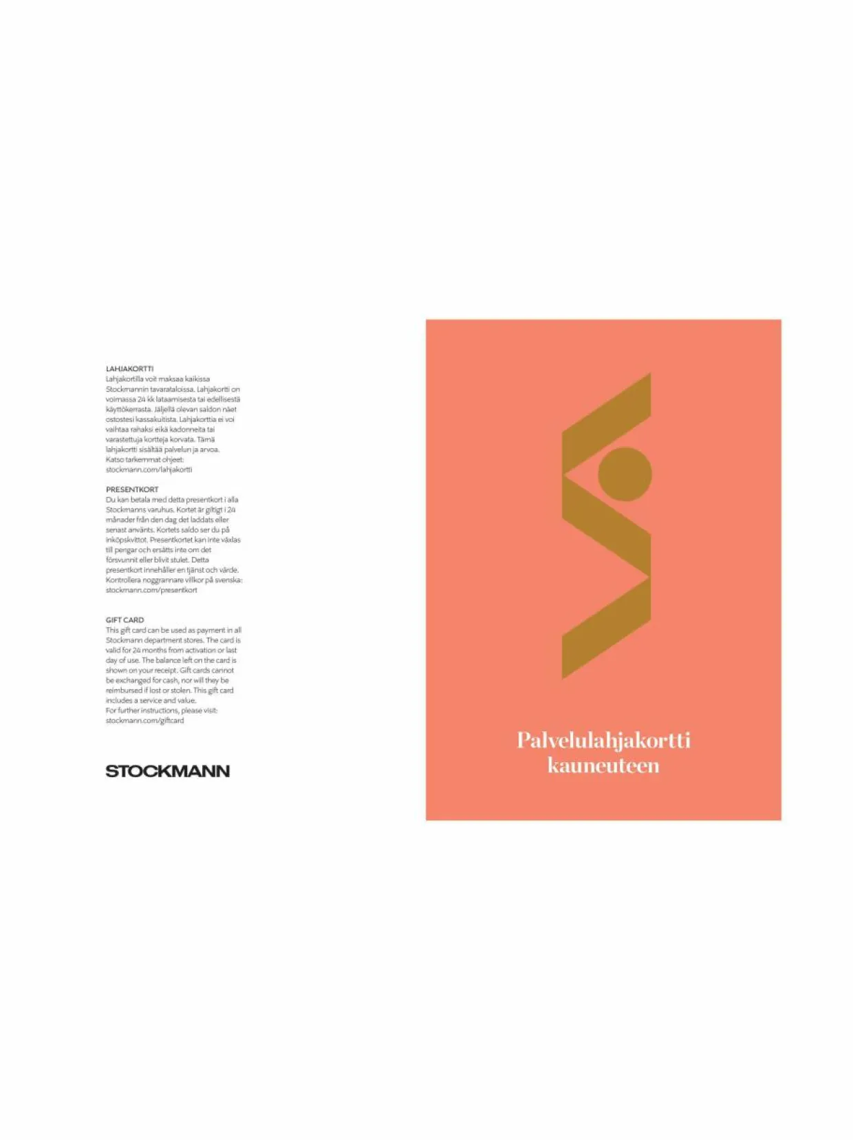 Varaa aika osoitteessa: stockmann.com/kauneuspalvelut.- Lahjakortilla voit maksaa kaikissa Stockmannin tavarataloissa.
