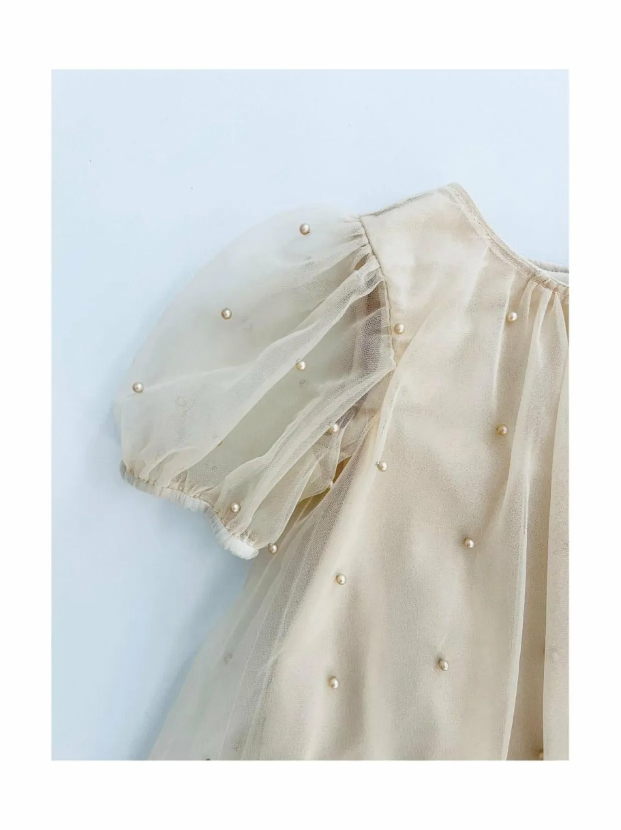Ihastuttava juhlamekko, joka sopii monipuolisesti useisiin juhlatilaisuuksiin. Mekossa on pyöreä pääntie ja lyhyet hihat. Mekko on viimeistelty herkällä tyllikankaalla, jossa on kauniit helmiyksityiskohdat. mekon helma on a-linjainen ja sisäpuolella on alusmekko, joka lisää käyttömukavuutta.