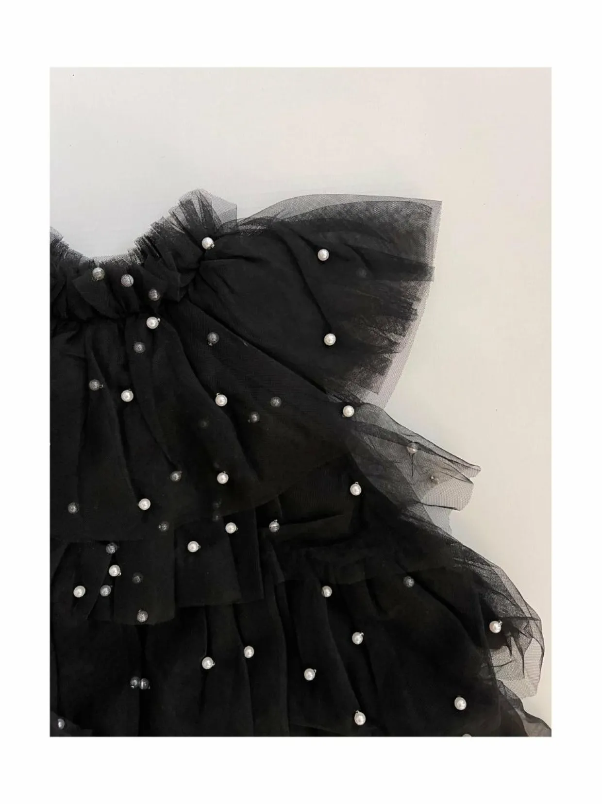Ihastuttava hihaton tyllimekko kaikille pikkuprinsessoille. Upea tylliunelma, jonka sävymaailma on dramaattinen ja viimeiltelty kauniisti kauttaaltaan helmillä. Mekon helma on runsas ja a-linjainen, useilla tyllikerroksilla, jotka tuovat volyymia asuun. Myös pääntie on viimeistelty tylliröyhelöllä.