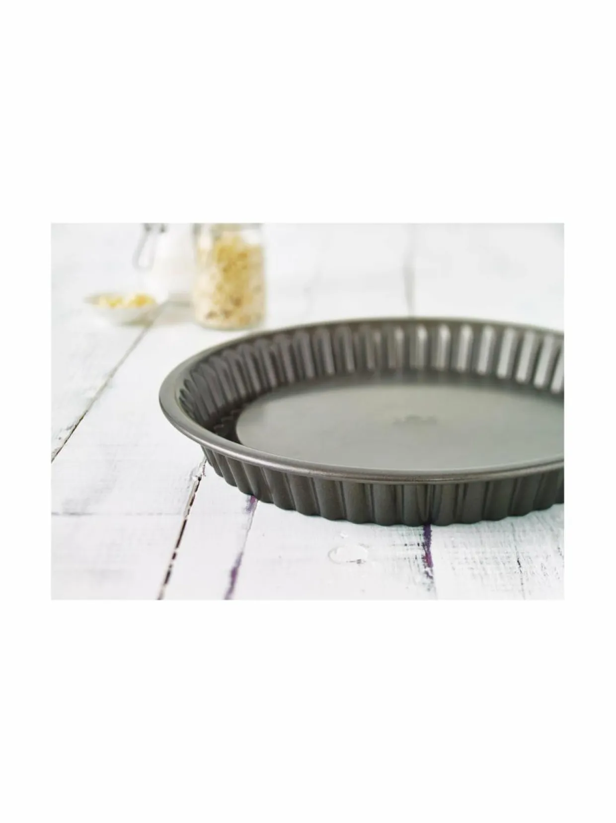 Tarttumattoman pinnoitteen ansiosta valmiin piirakan saa vaivattomasti irti vuoasta. Vuoan halkaisija on 30 cm ja korkeus 4,5 cm.