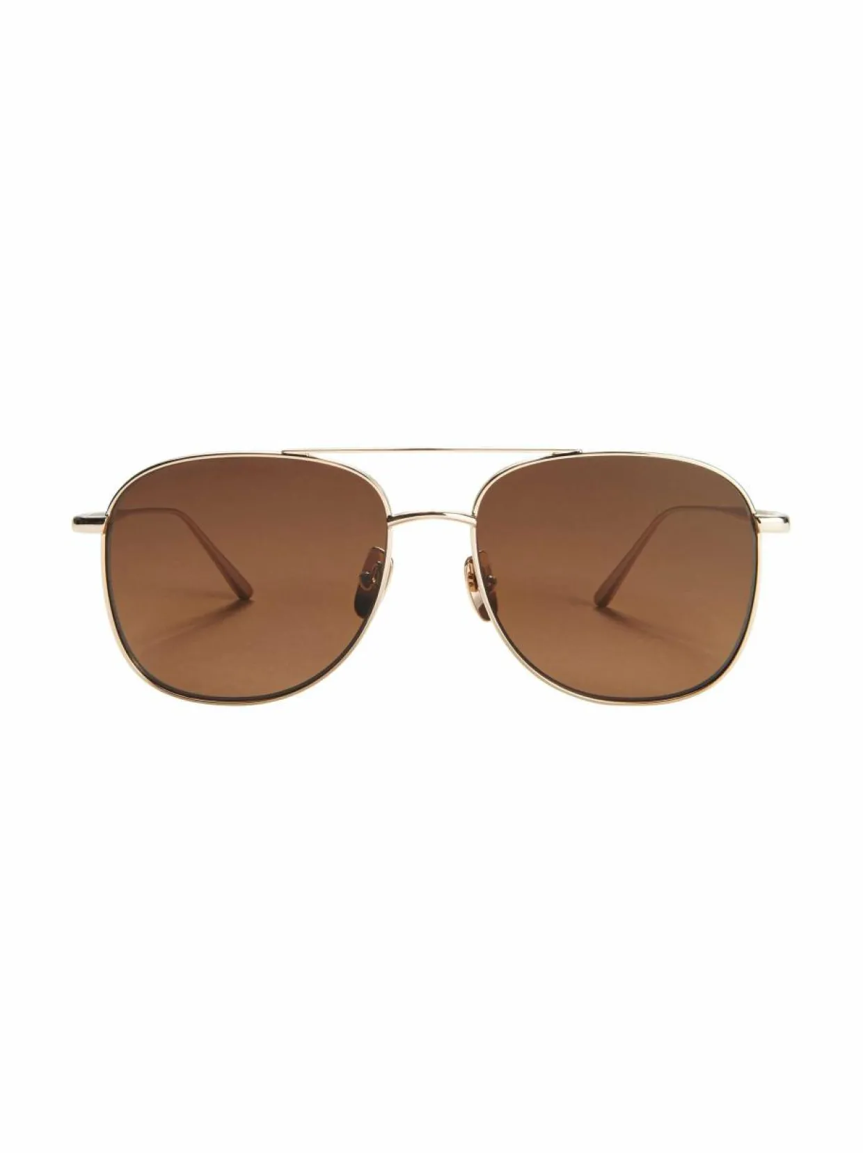 Tuo asuusi väriä ruotsalaisen Chimin aurinkolaseilla! Pilot-aurinkolaseissa on klassiseen kulmaan muotoillut soikeat kehykset, joissa on suuret linssit. Kehykset on käsin muotoiltu himmeän kullan sävyisestä ruostumattomasta teräksestä, ja niissä on ruskeat polarisoidut linssit.