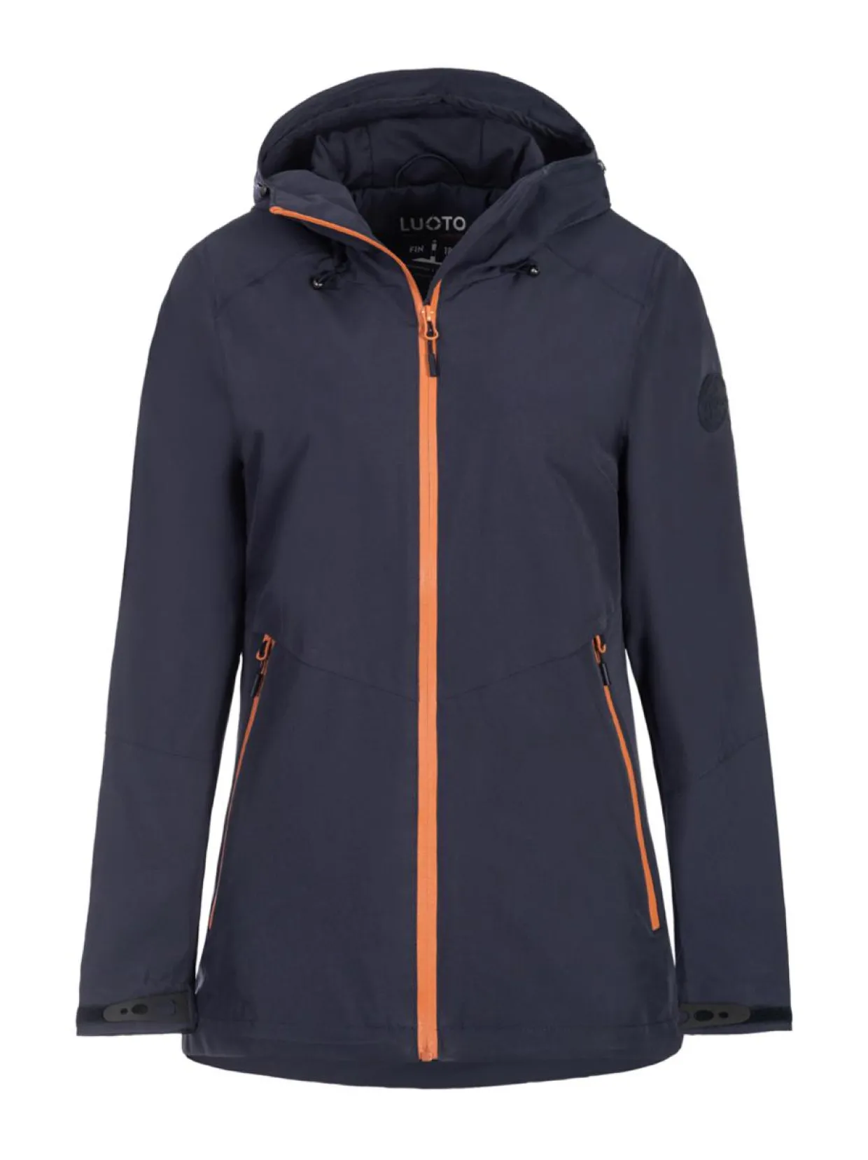 Luoto Pilvi – Naisten ulkoilutakki. Korkea kaulus pitää kaulan lämpimänä navakammallakin tuulella. Pikkutavarat pysyvät matkassa mukana vetoketjullisissa taskuissa. Taskujen vetoketjut ovat vedenpitäviä. Takin istuvuutta voi säätää mieleisekseen takin hupusta, helmasta ja hihansuista. Päällikankaassa on ympäristöystävällinen PFC-vapaa vedenhylkivyyskäsittely.