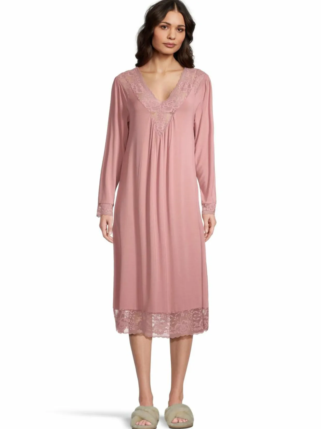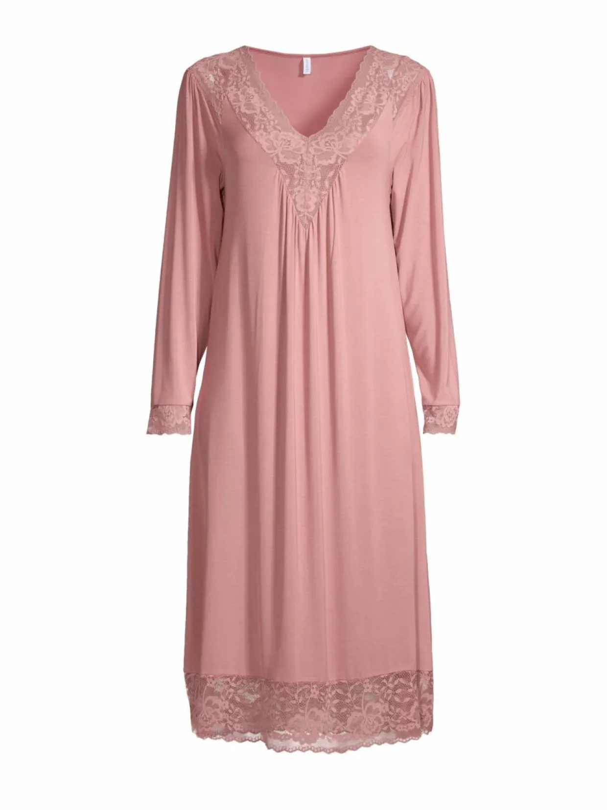 Damellan pitkähihainen yömekko on valmistettu miellyttävän viileästä Ecovero-viskoosista, johon on lisätty elastaania tuomaan joustoa. Mekon pääntiessä, hihansuissa ja helmassa on läpikuultavat pitsipaneelit. Mallissa on syvään uurrettu V-pääntie.