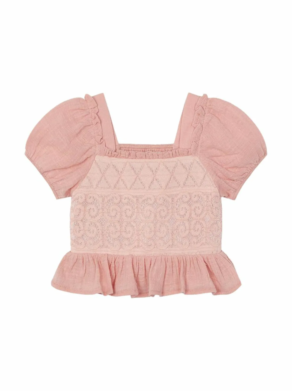 Juhlava röyhelösomisteinen pusero puhvihihoilla. Etupuolella kaunis pitsibrodeeraus. Takana joustavaa smokkirypytystä. Korkean puuvillapitoisuuden ansiosta materiaali on hengittävää ja ihoystävällistä.