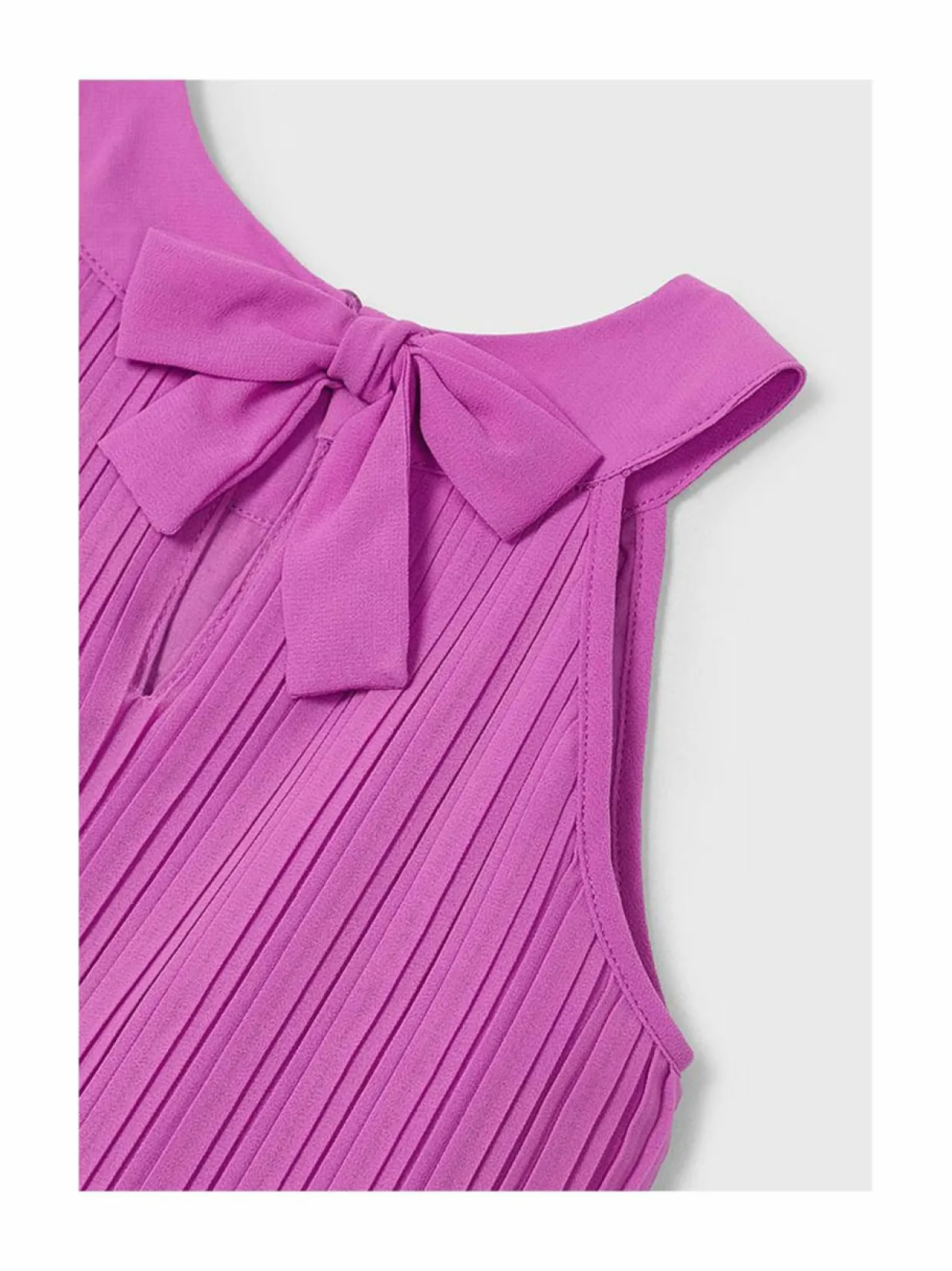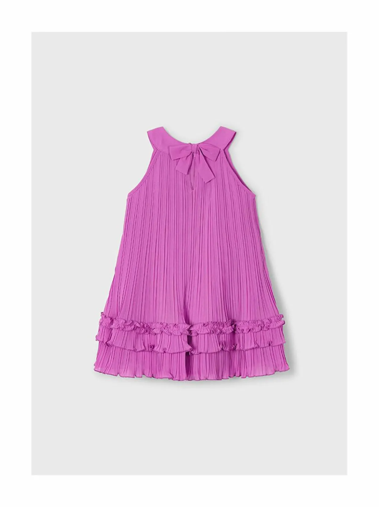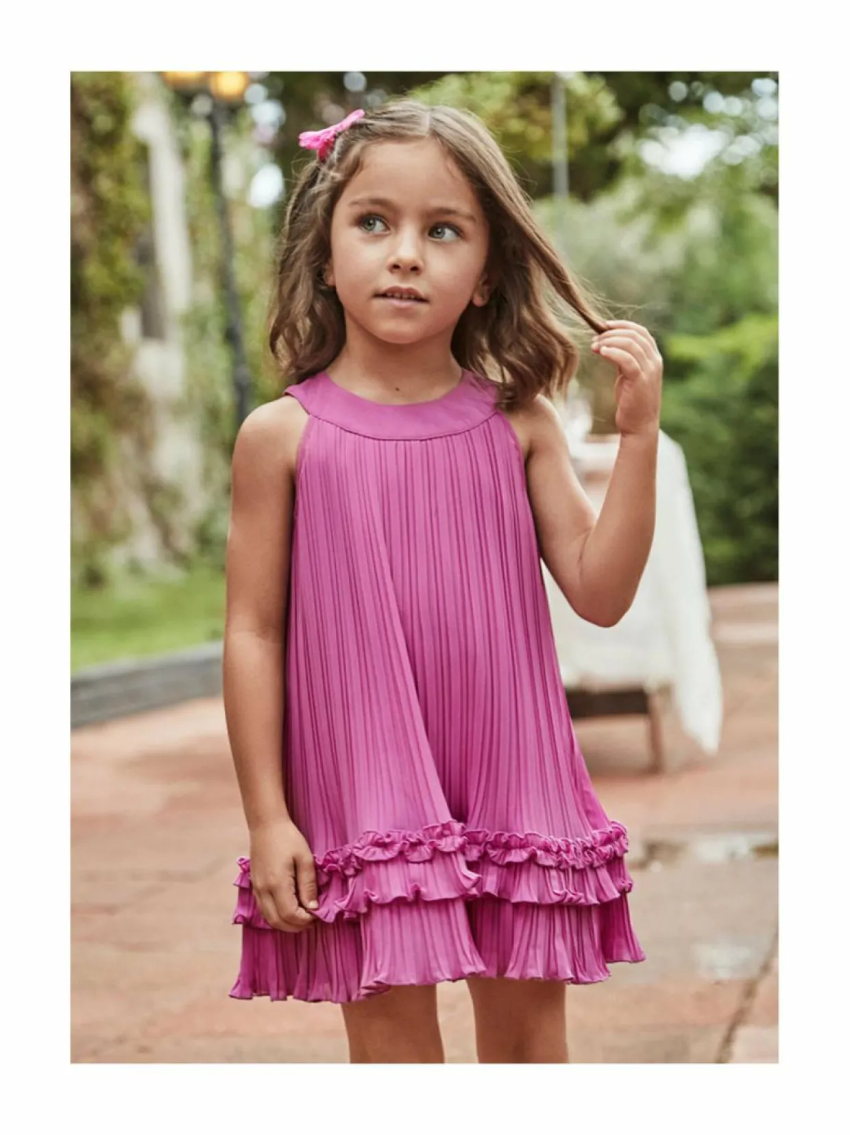 Kaunis pliseerattu mekko Mayoralilta on valmistettu 100 % polyesteristä. Mekossa on kaksi kerrosta röyhelöitä helmassa. Mallissa on pyöreä pääntie ja niskassa on napilla kiinnitettävä pisara-aukko sekä rusetti. Mekko on mukava ja helppo pukea päälle. Mekko sopii täydellisesti juhliin ja muihin erityistilaisuuksiin.