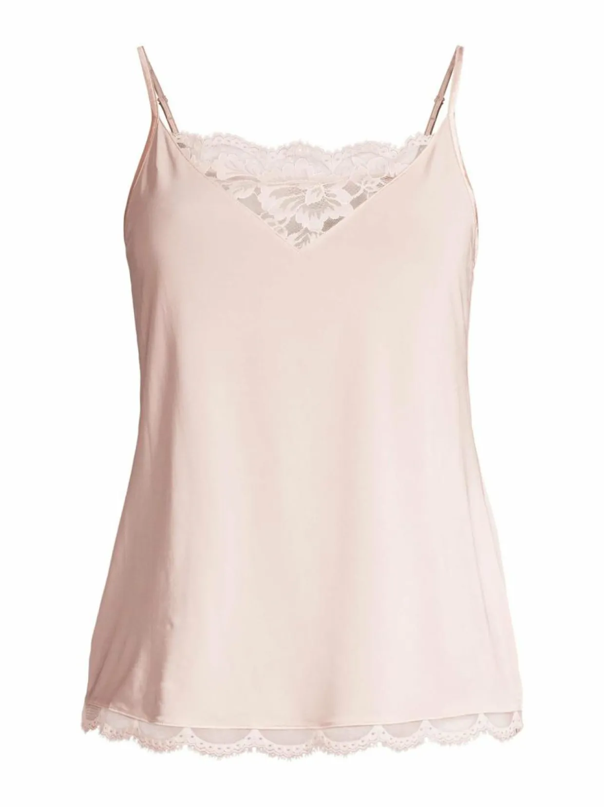Mey Poetry Vogue Camisole -toppi on naisellinen ja vartalonmyötäinen. Siinä on v-pääntie ja pitsisomisteet pääntiellä ja helmassa. Aluspaita on valmistettu ilmavasta ja laskeutuvasta viskoosista, jossa on hienovarainen kiilto. Säädettävät spagettiolkaimet tuovat käyttömukavuutta. Ihoystävällinen ja miellyttävän tuntuinen viskoosikuitu on FSC-sertifioitu, joka tuntuu ihoa vasten miellyttävältä ja pehmeän sileältä.Mey Poetry Vogue Camisole -toppi sopii täydellisesti niin arkeen kuin juhlaan. Yhdistä se farkkuihin ja neuletakkiin rentoon tyyliin tai pukeudu juhlavammin hameen ja korkokenkien kanssa.