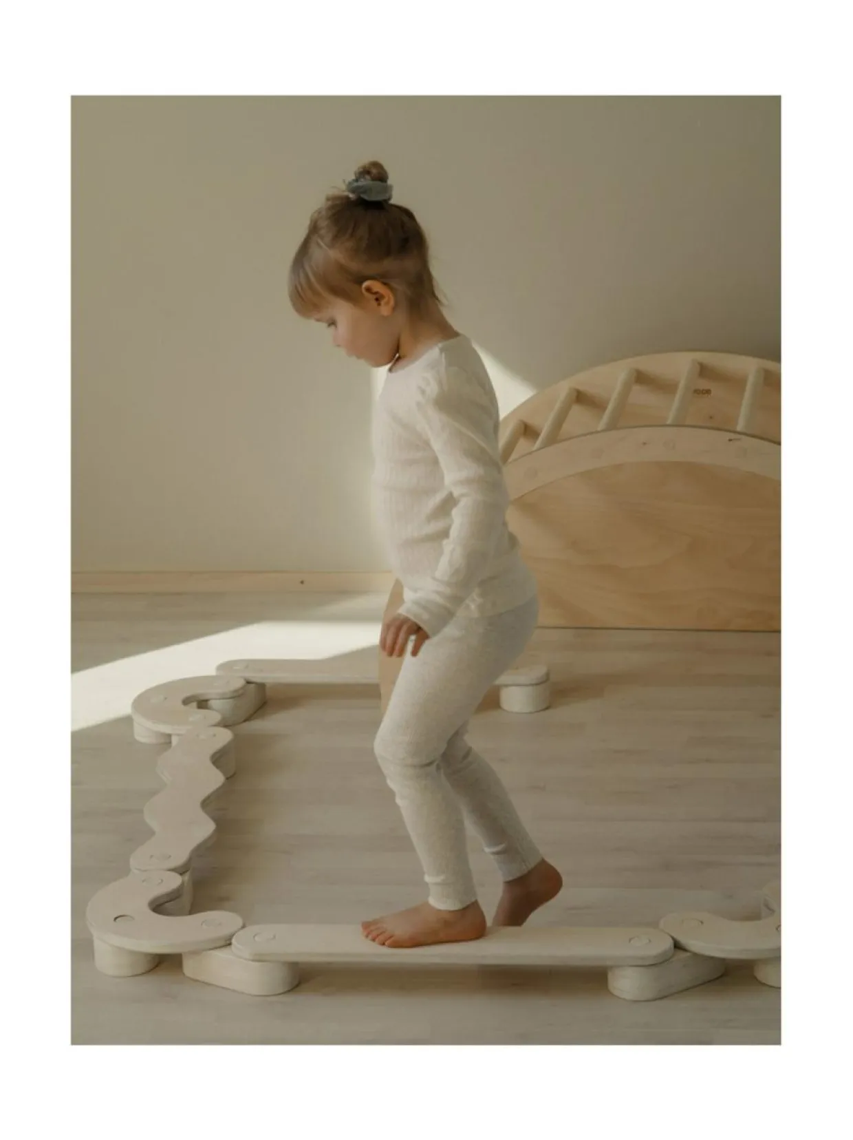 POLKU S on täydellinen vaihtoehto pienille lapsille, jotka ovat jo oppineet kävelemään ja ovat valmiita alkamaan kehittämään omia tasapaino- ja koordinaatiokykyjään. Suosittelemme aloittamaan tasapainoharjoittelut tutustumalla rataan ensin asettamalla puomit lattialle ilman välikappaleita.