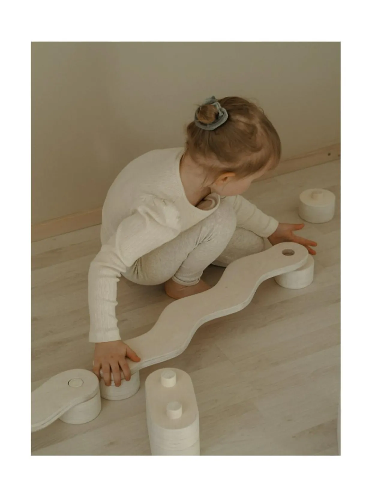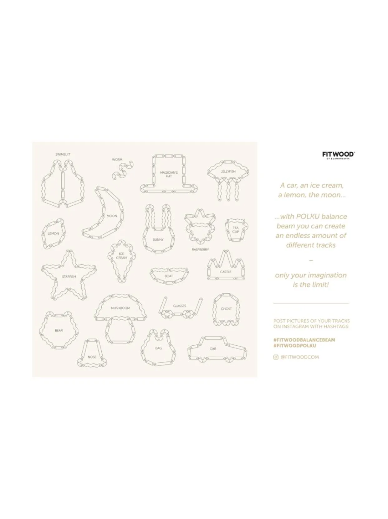 Kokeneemmille tasapainoilijoille ja pelottomille ratojen suunnittelijoille meillä on POLKU L, jossa on yhteensä kahdeksan puomia ja kymmenen välikappaletta mitä mielikuvituksellisimpien kokonaisuuksien rakentamiseen. L on paras valinta etenkin silloin, kun useampi lapsi haluaa leikkiä tasapainoradalla samaan aikaan, tai jos haluat tarjota lapsellesi enemmän vaihtoehtoja erilaisten kokonaisuuksien rakentamiseen.