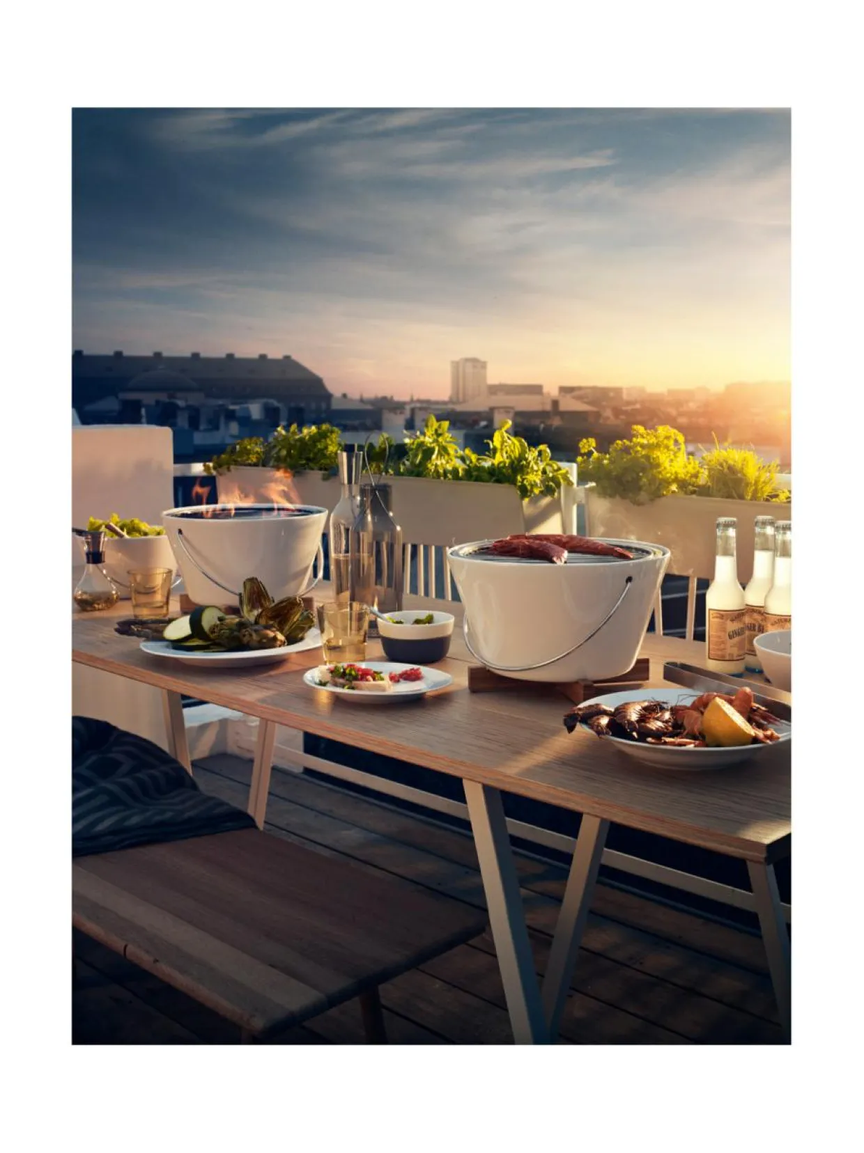 Eva Solon pöytägrillin avulla kesäiset illanistujaiset nousevat aivan uudelle tasolle. Yksinkertaisen tyylikäs pöytägrilli on kattauksen keskipiste, jonka ritilällä vieraasi voivat grillata pientä naposteltavaa pöydästä nousematta. Pöytägrilli soveltuu mainiosti vaikkapa pienen seurueen tapas-iltoihin ja kätevän kantokahvan ansiosta se on helppo ottaa mukaan myös puistoon tai rantapiknikille. Tuote koostuu valkoisesta posliinikulhosta, pohjan lämpösuojasta, hiiliastiasta telineineen, paistoritilästä ja tukevasta puualustasta. Kaikki osat puualustaa lukuun ottamatta voidaan pestä astianpesukoneessa.
