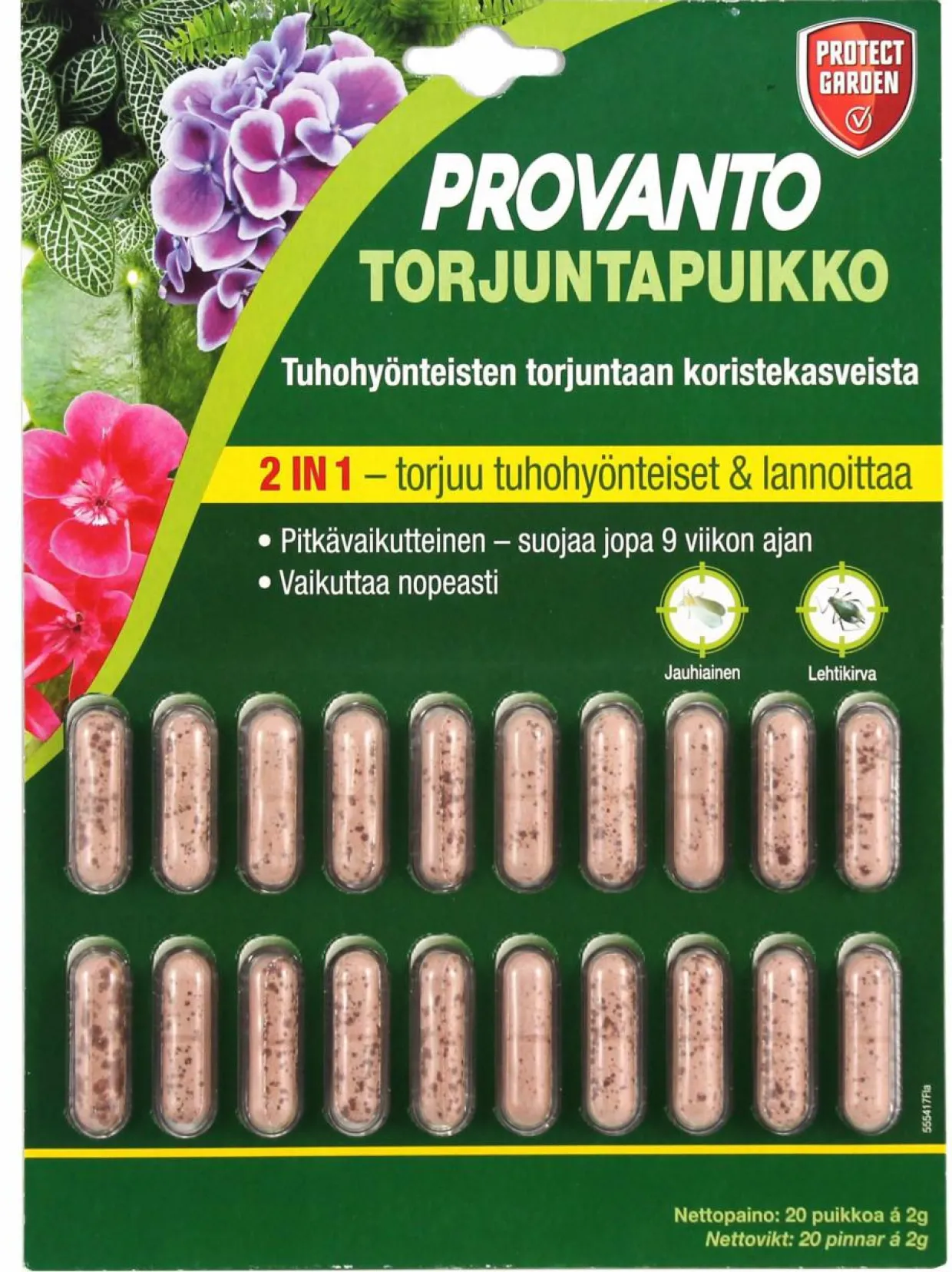 Provanto Care 2-in-1 -torjuntapuikot on tarkoitettu koristekasvien tuhohyönteisten torjuntaan sisätiloissa. Torjuntapuikko on helppo tapa torjua tuhohyönteiset koristekasveista. Puikko vaikuttaa systeemisesti leviten kasvin juurien kautta kaikkiin kasvinosiin antaen jopa 9 viikon suojan. Sisältää myös kasvin kasvua edistäviä ravinteita.