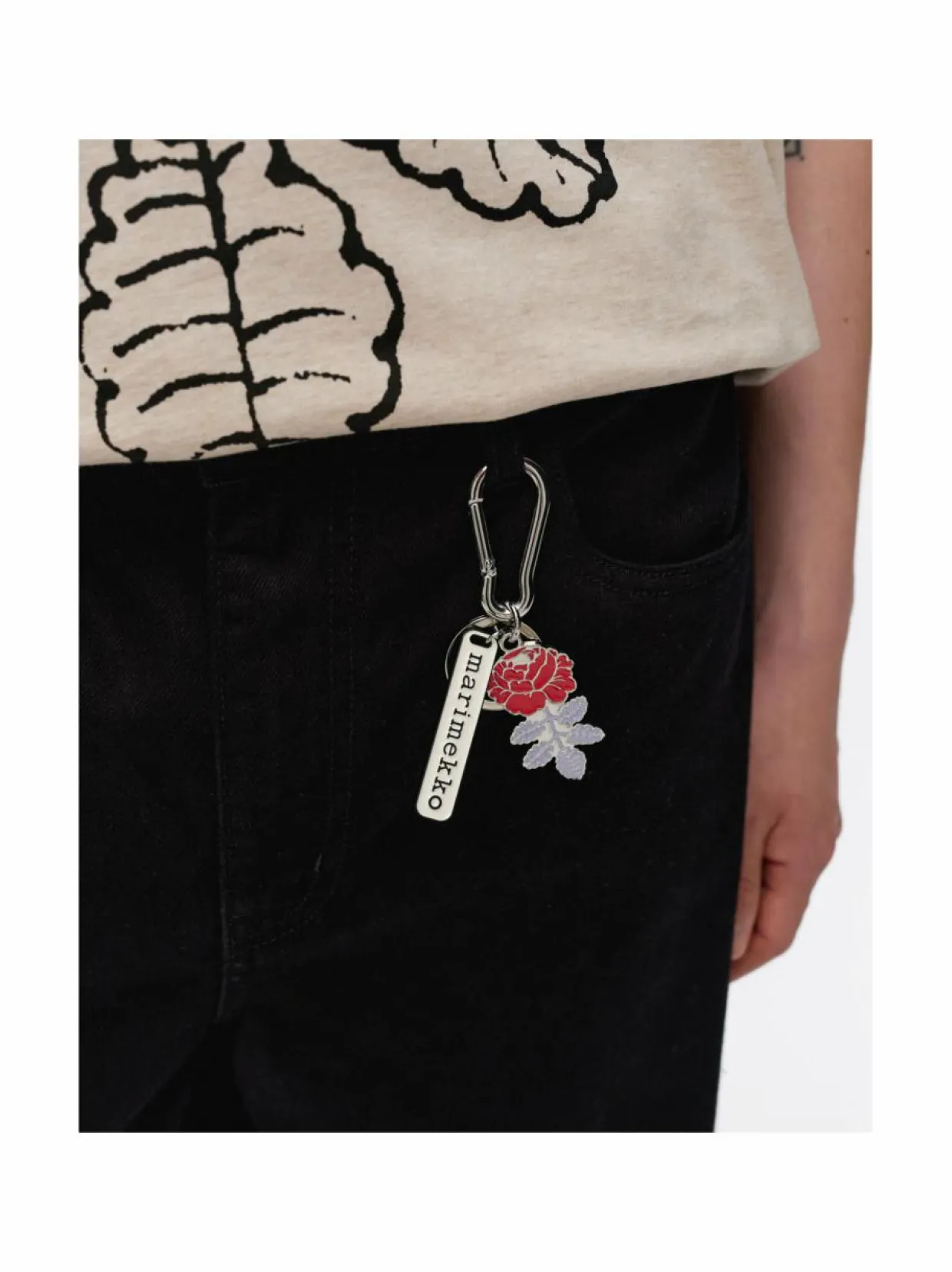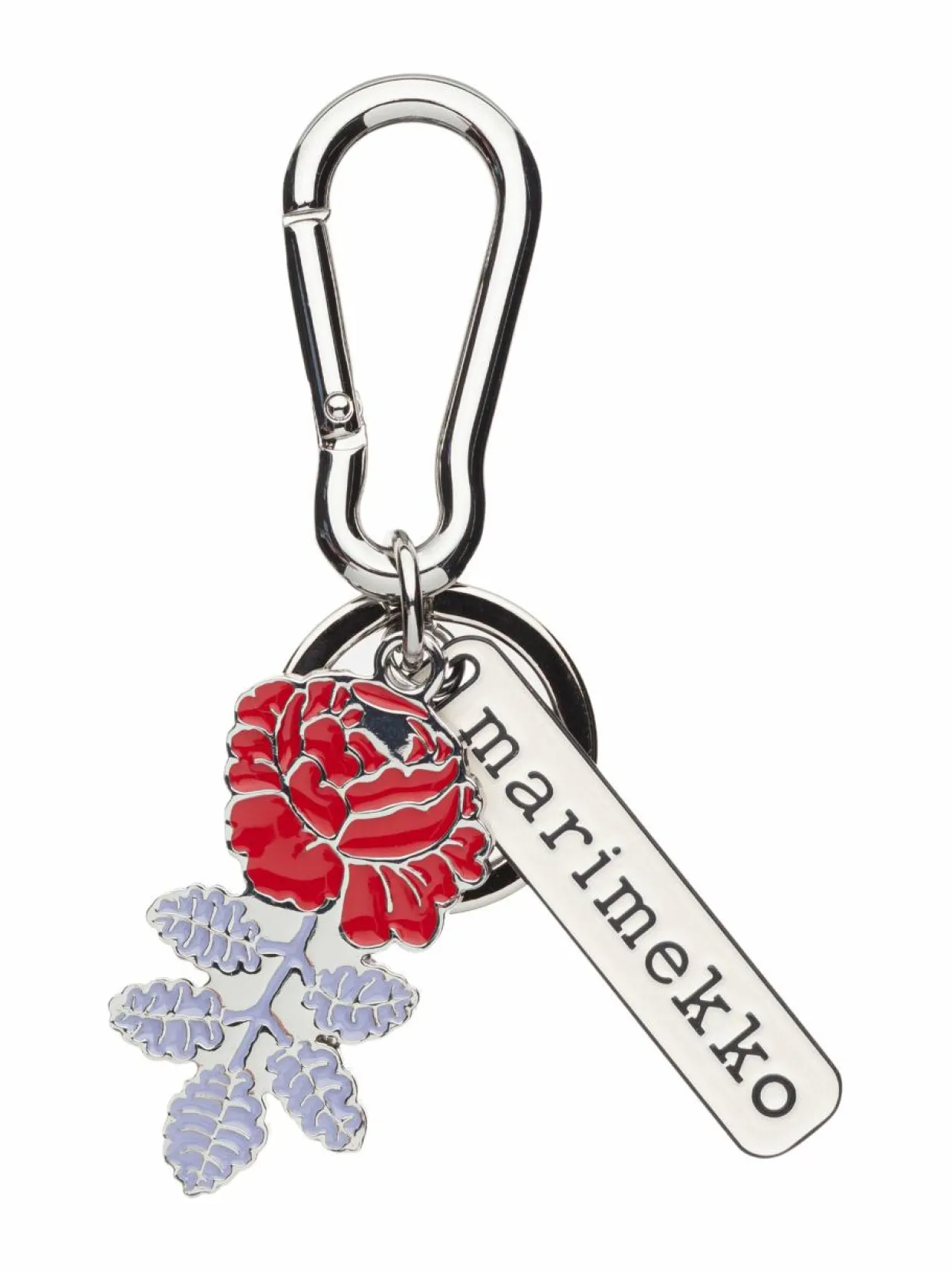 Kauniissa Puhallus Vihkiruusu Kioski -avaimenperässä on eloisia kukkia ja Marimekon logo. Avaimenperän metallinen materiaali antaa sille kiiltävän pinnan, joka kestää käyttöä. Se on täydellinen tapa pitää avaimet järjestyksessä ja lisätä ripaus väriä arkeen.