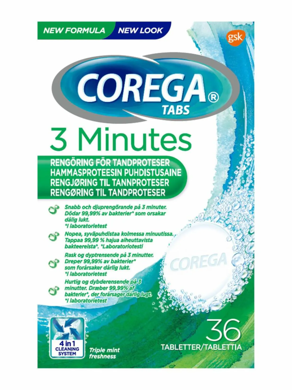 Corega Tabs -puhdistustabletti puhdistaa hammasproteesin tehokkaasti kolmessa minuutissa. Puhdistaa tehokkaasti ruoantähteet, hammaskiven, värjäymät sekä tuhoaa pahanhajuista hengitystä aiheuttavat bakteerit.
