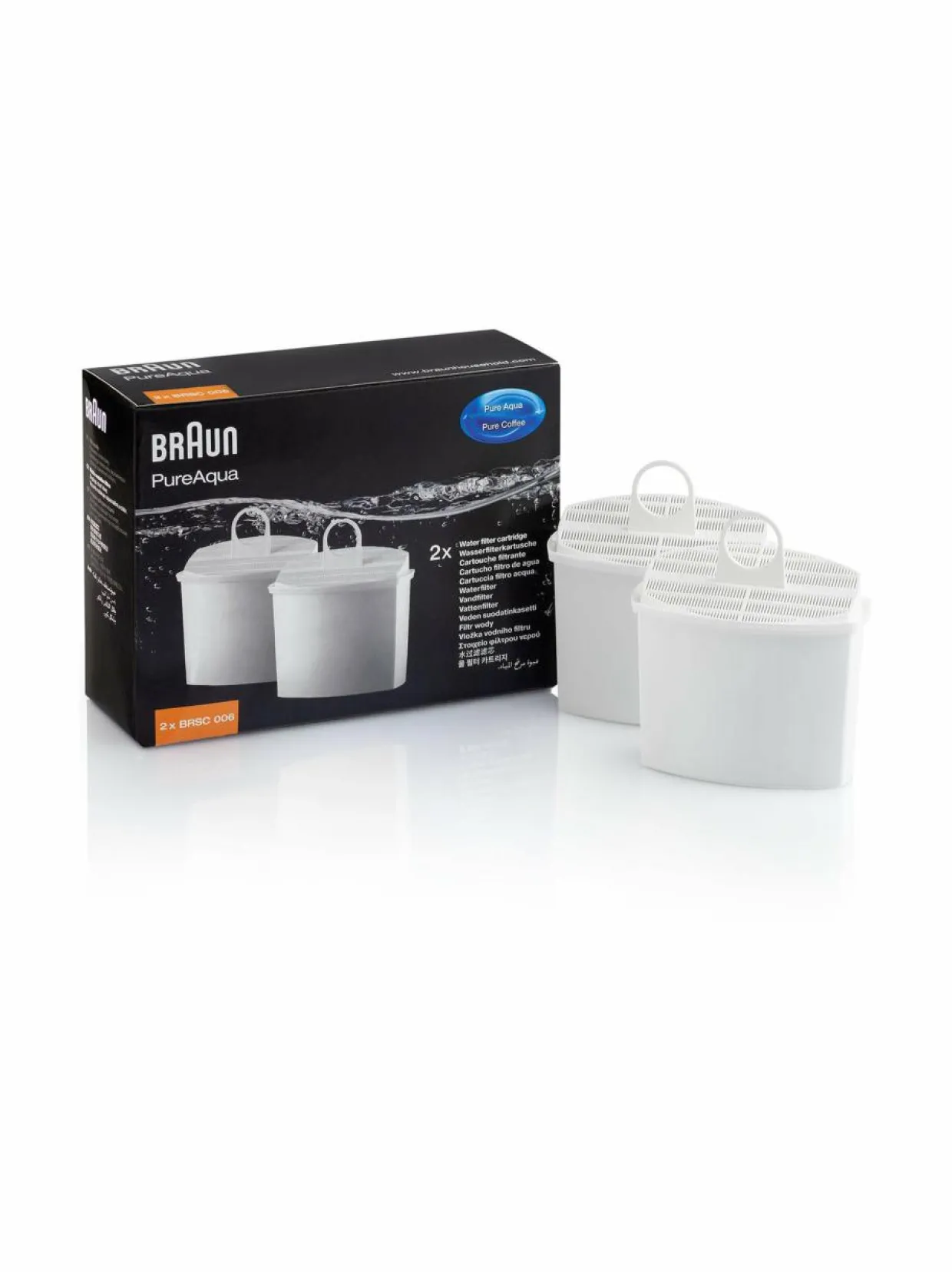 Vedensuodatin suodattaa vedestä pois epäpuhtauksia ja klooria. Pakkauksessa on kaksi suodatinta, jotka sopivat Braunin kahvinkeittimiin.