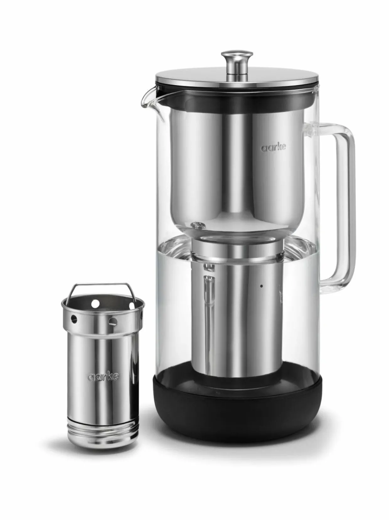 Aarke Purifier on patentoitu, korkealaatuinen veden suodatinkannu, joka on valmistettu lasista ja ruostumattomasta teräksestä – se on kestävämpi ja hygieenisempi. Siinä on ainutlaatuinen, uudelleen täytettävä patruuna ja Pure-suodatin rakeita. Suodatinrakeet kaadetaan ruostumattomasta teräksestä valmistettuun suodatinpatruunaan ja ne vähentävät klooria, raskasmetalleja ja kalkkia vedessä.