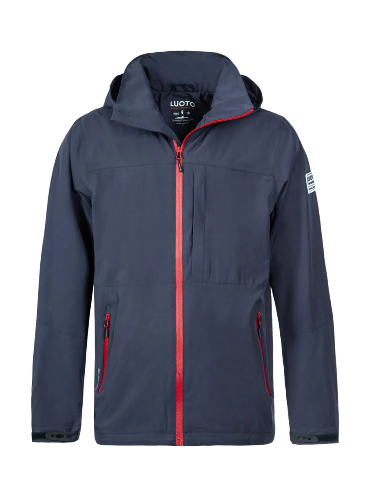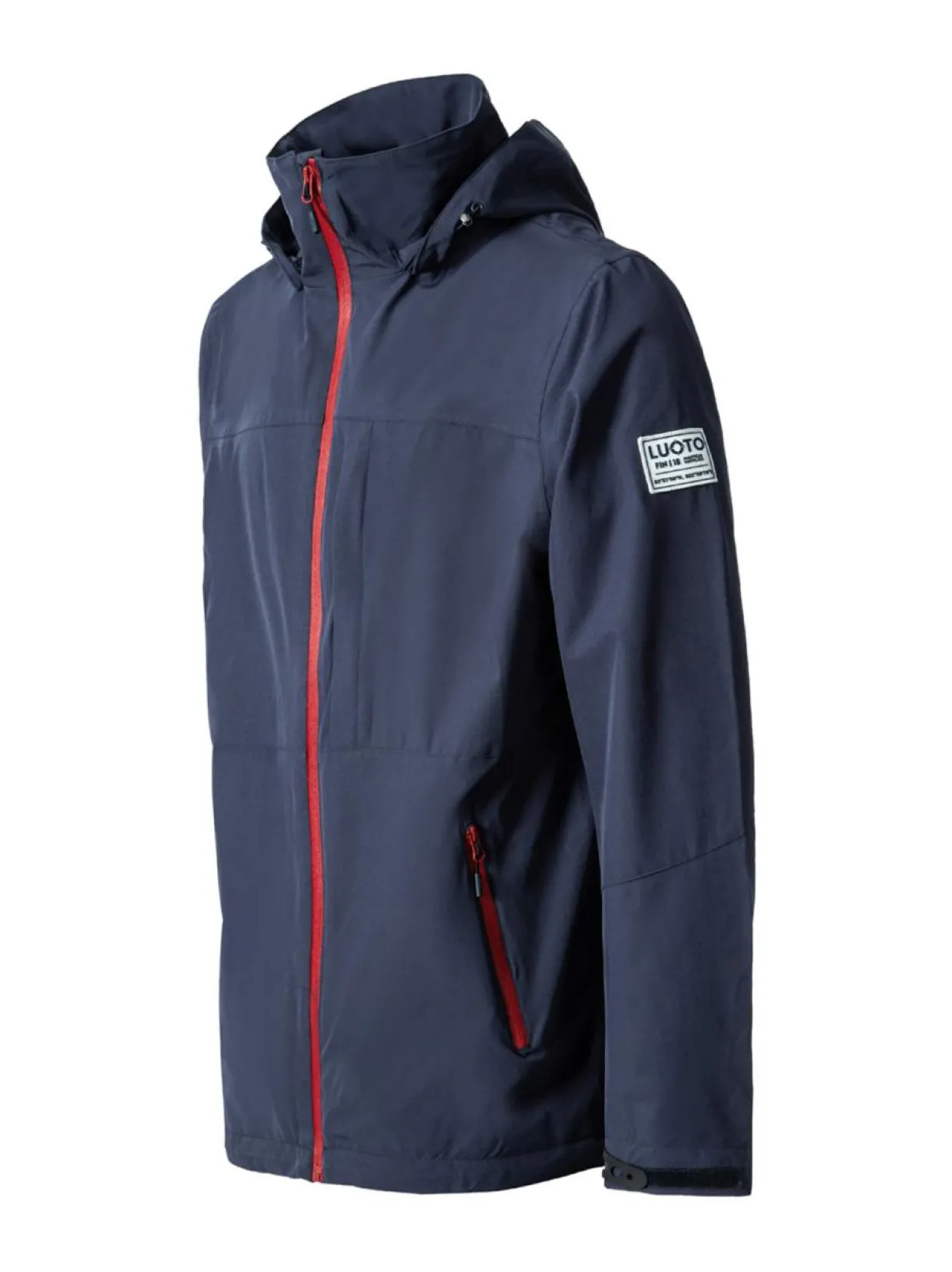 Luoto Puuska – Miesten ulkoilutakki. Korkea kaulus pitää kaulan lämpimänä navakammallakin tuulella. Pikkutavarat pysyvät matkassa mukana vetoketjullisissa taskuissa. Taskujen vetoketjut ovat vedenpitäviä. Takin istuvuutta voi säätää mieleisekseen takin hupusta, helmasta ja hihansuista. Mikäli huppu ei ole sinun juttusi, sen voi myös irroittaa. Päällikankaassa on ympäristöystävällinen PFC-vapaa vedenhylkivyyskäsittely.
