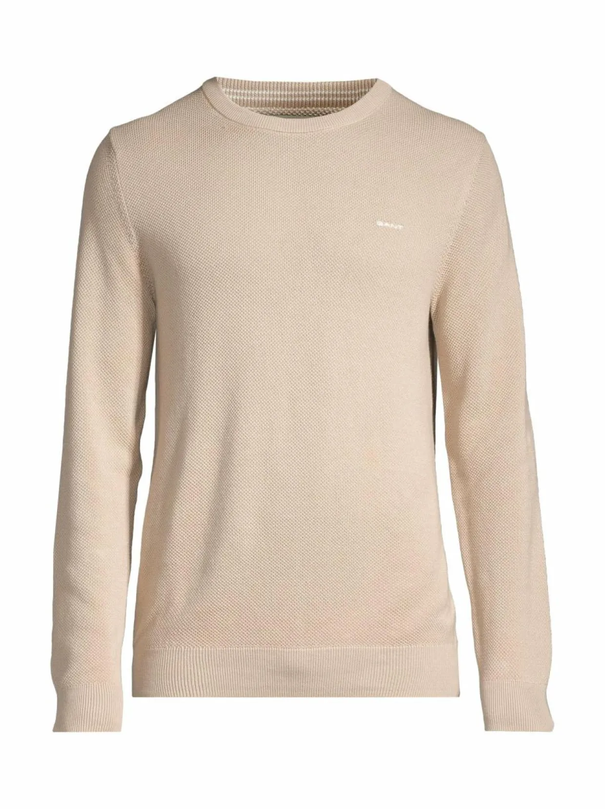 Yksinkertainen mutta monikäyttöinen neulepusero on valmistettu puuvillapikeestä, ja siinä on klassinen pyöreä pääntie. Pääntieresorin sisäpuolella on kontrastivärinen raita. Joustinneulosta löytyy helmassa, hihansuissa sekä pääntiessä. Puuvillaneuleessa on regular fit -mitoitus ja rinnassa klassinen kirjailtu GANT-logoteksti.