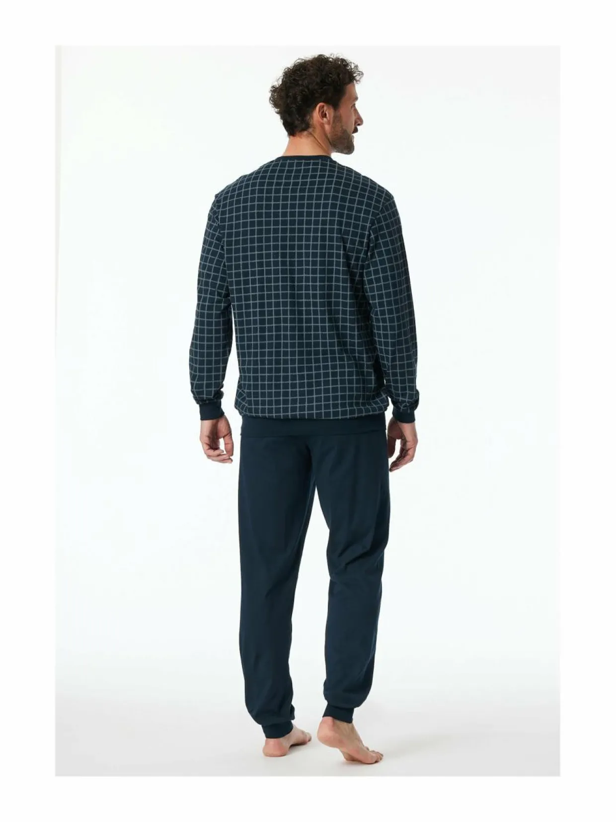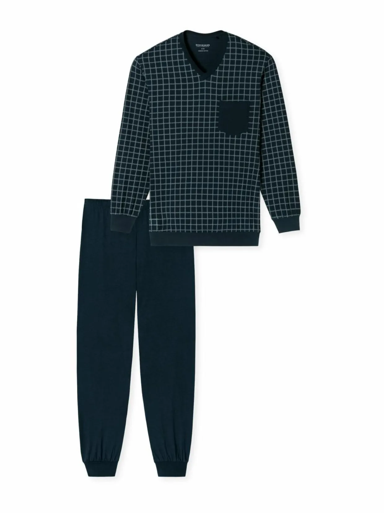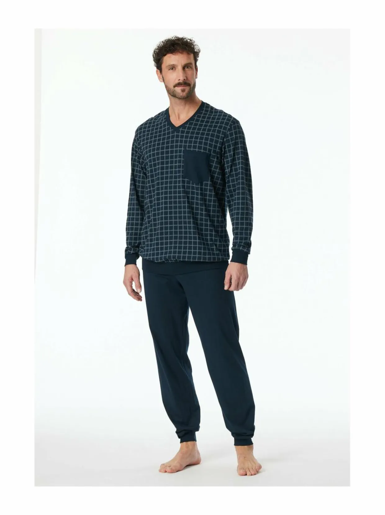 Schiesserin jersey-pyjamasetti, johon kuuluvat pyjamahousut ja -paita. Housuissa on resorit lahkeensuissa ja vyötärö on joustavasti poimutettu. Ruudullista paitaa tyylittävät rintatasku, resorit ja V-pääntie.