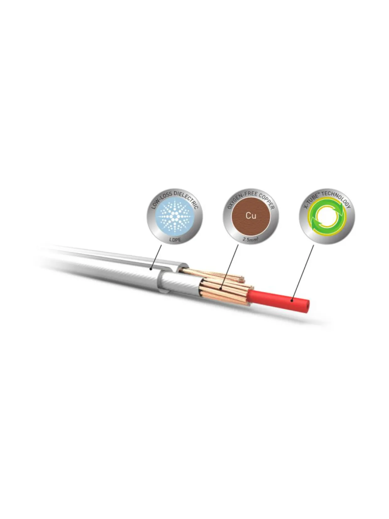 QED:llä tiedämme, että kaiutinkaapelin alhainen DC-vastus on ensiarvoisen tärkeää korkealaatuisen signaalinsiirron kannalta. Tämä johtuu siitä, että kaiutin näkyy taajuudesta riippuvana kuormituksena vahvistimelle, ja kaapeli muodostaa tämän kanssa muuttuvan ketjun. Jos vastuksen sallitaan olevan liian suuri, kaiuttimen taajuusvasteeseen tulee muutoksia, joita vahvistimen negatiivinen takaisinkytkentäsilmukka ei voi korjata. XT25:n poikkipinta-ala on laajennettu 2,5 mm2:ksi 99,999% happivapaata kuparia. Tämä alentaa uuden kaapelin DC-vastuksen erittäin matalalle tasolle ja parantaa näinollen musikaalista tarkkuutta.