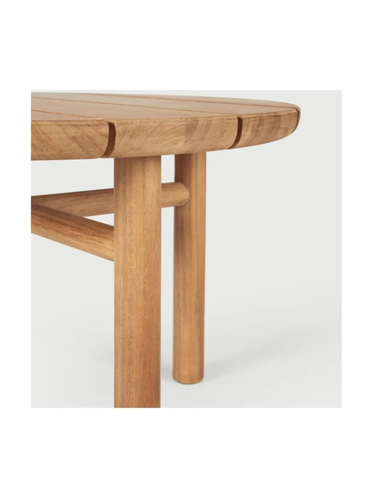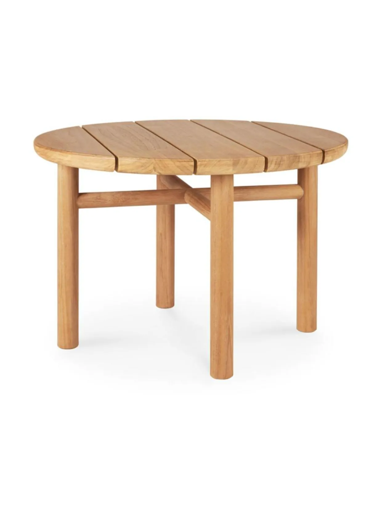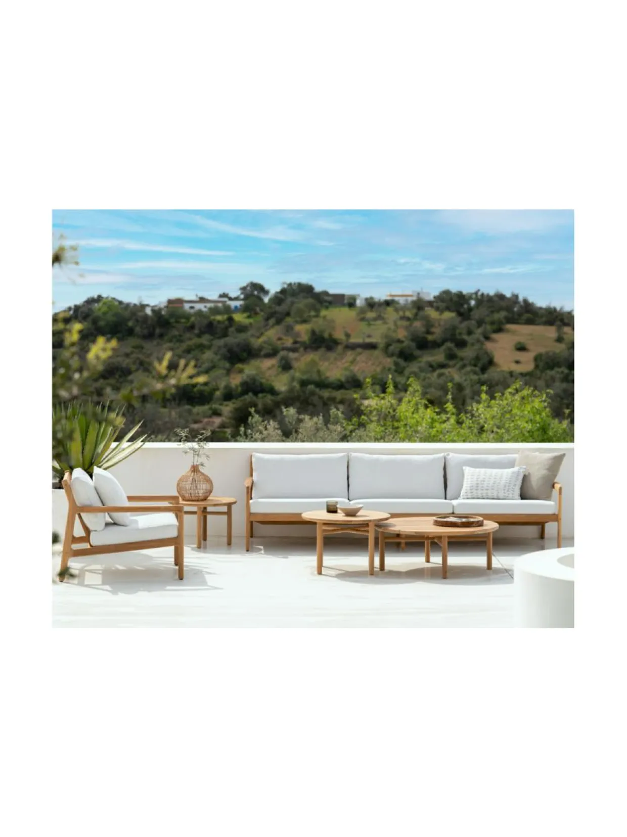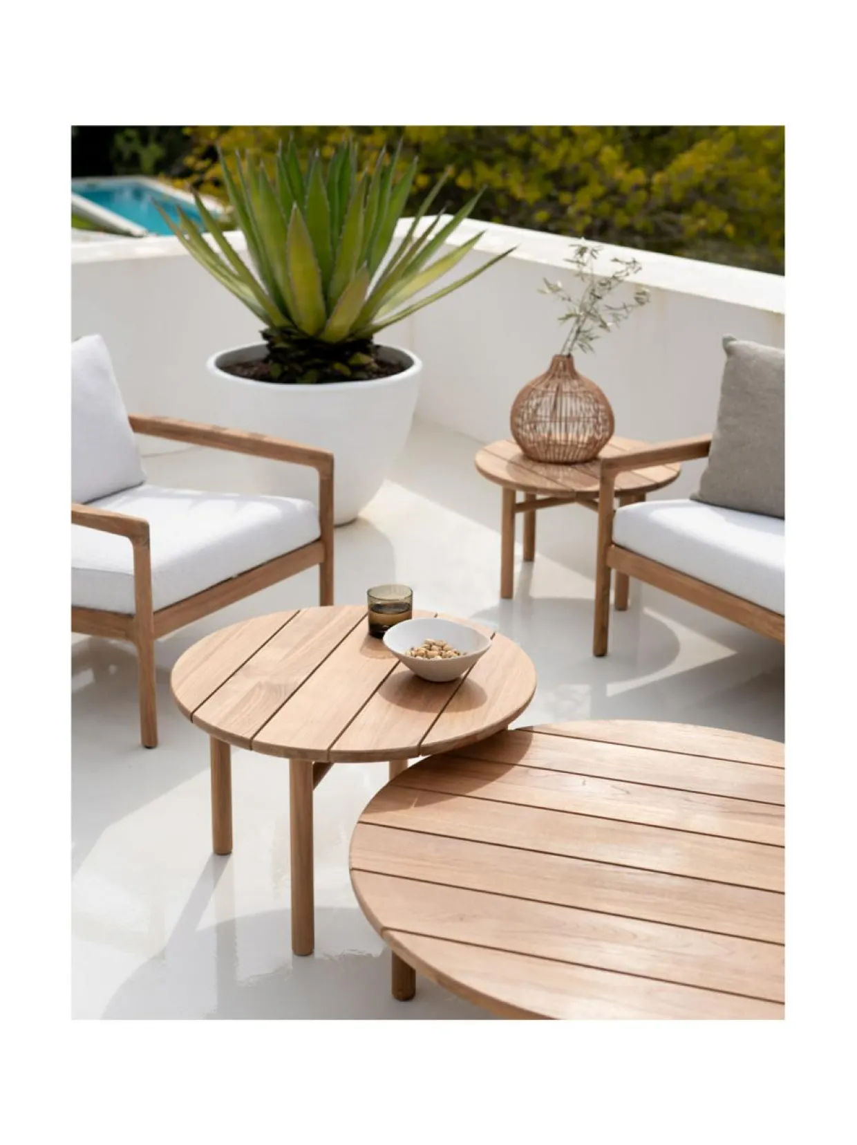 Quatro outdoor teak -sohvapöytä on pyöreä, massiivitiikkinen sohvapöytä terassillesi. Käsittelemätön tiikki ei tarvitse huoltoa ja se saa ajan kuluessa kauniin harmaan patinan.