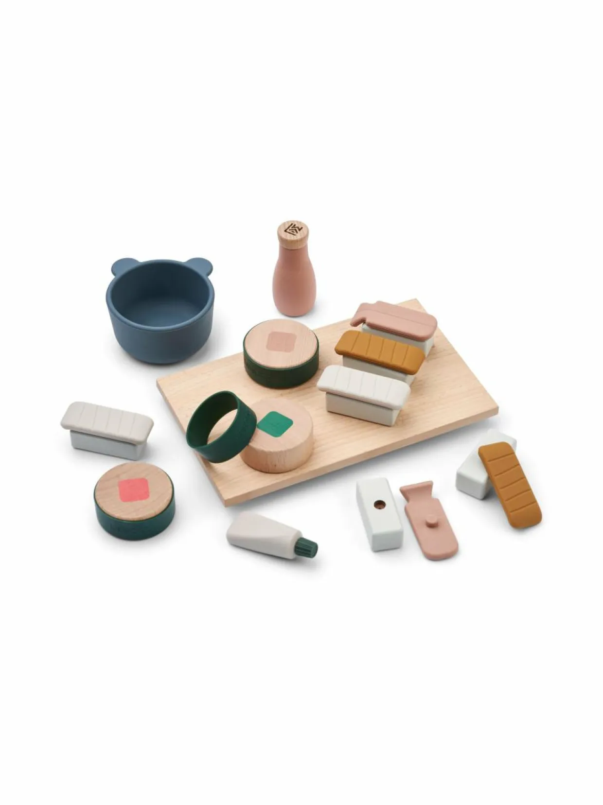Tuotenumero167858995 MateriaaliSilikonia, puuta ja MDF-levyä ValmistusmaaKiina Väri2313 SANDY MULTI MIX KokoOne size AvainsanatLiewood, sushi lelu, leikkisushi