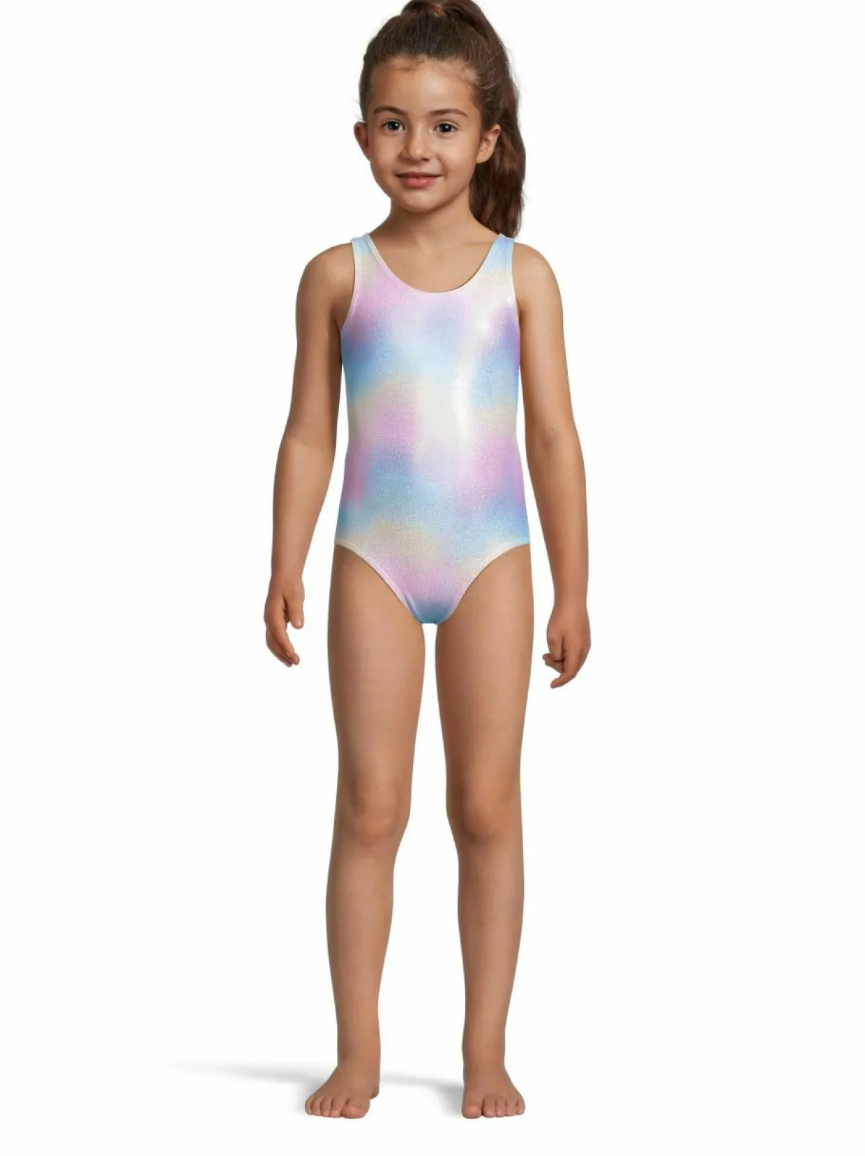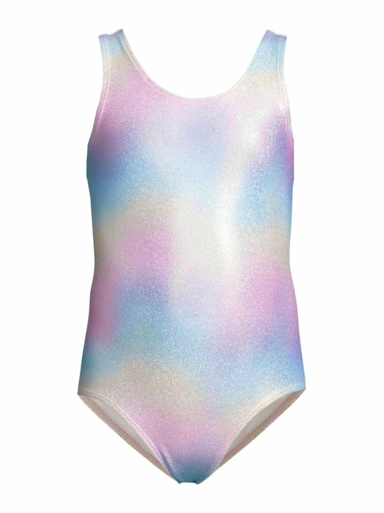 Sateenkaarenvärinen vuorattu uimapuku pehmeästä ja kiiltävästä materiaalista. Joustava ja nopeasti kuivuva kangas.