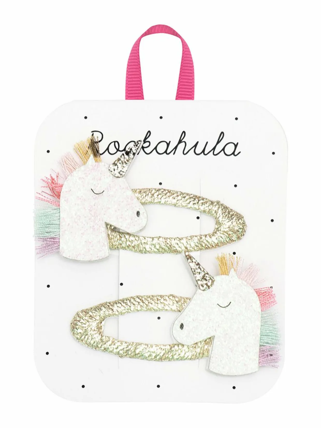 Rockahulan yksisarvisen aiheinen hiuspinnisetti. Hiuskoristeet ovat kääritty nauhaan lisäämään pehmeyttä. Pakkauksesta löydät kaksi hiuspinniä. Ei sovellu alle 36 kuukauden ikäisille lapsille.