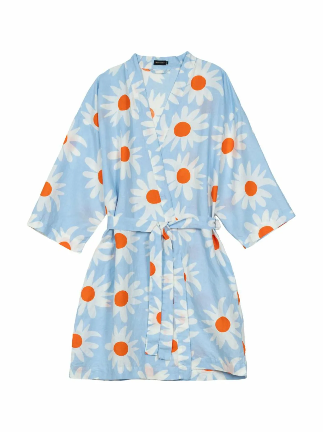 Materiaali50 % puuvilla, 50 % pellava Hoito-ohjeetHienopesu 30 asteessa KuviosuunnittelijaMaija Isola Väri520 LT.BLUE, OFF WHITE, ORANGE Avainsanataamutakki, kimono, puuvillapellava, Marimekko, Rakastaa ei rakasta, kesä, pellava aamutakki