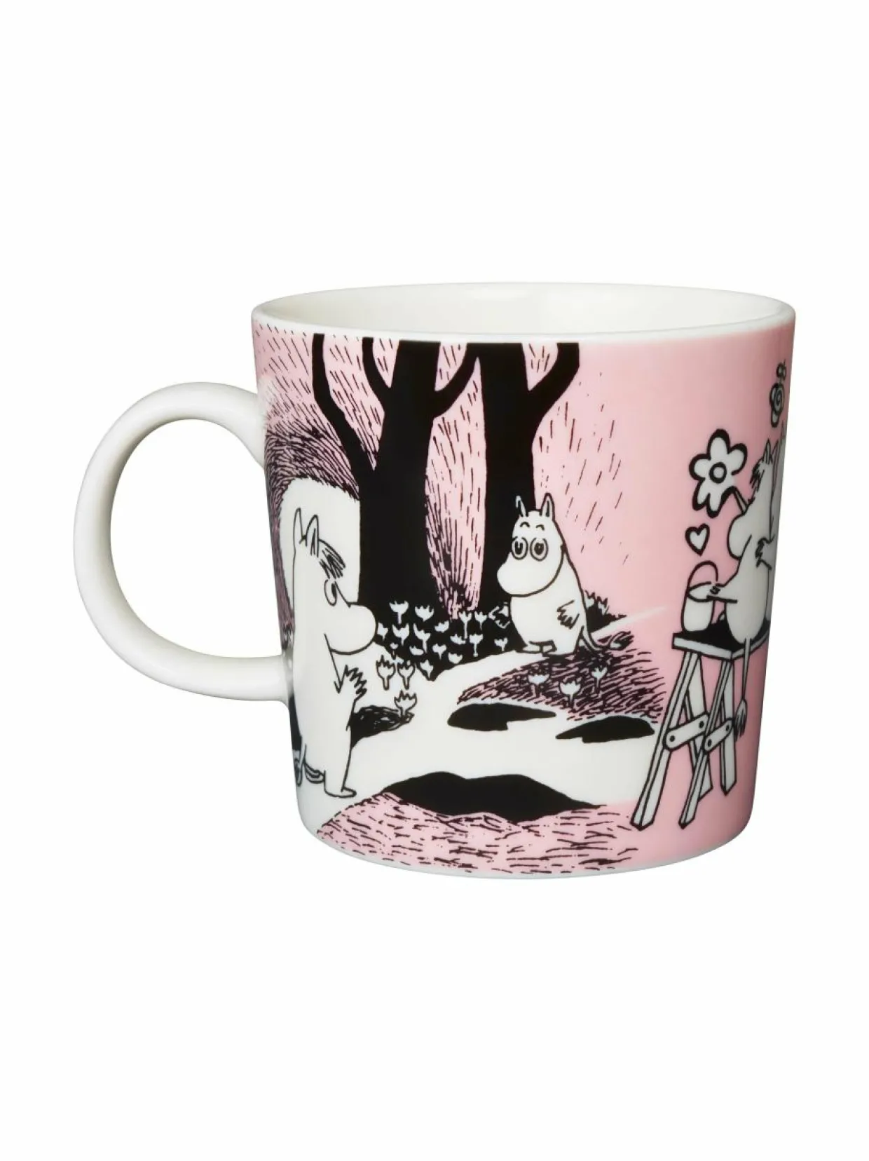 Halaus armaalle. Vaaleanpunaisen mukin kuvitus huokuu herkkää tunnelmaa. Arabian Muumi-astiat ovat uunin-, mikroaaltouunin- ja konepesunkestävää keramiikkaa. Ne kestävät myös ruoan pakastamisen.