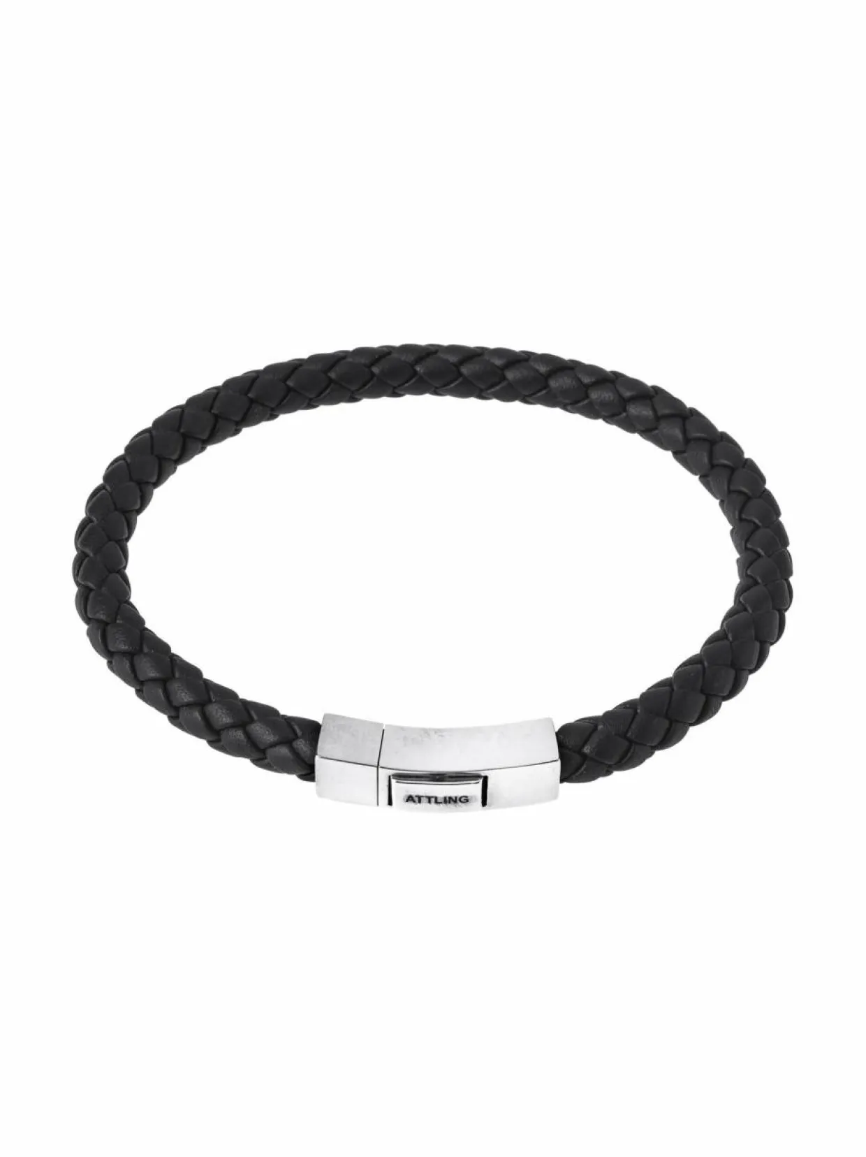 Efva Attlingin rannekorussa on punottua nahkaa ja sterling-hopeinen solkimekanismi. Vähäeleinen rannekoru on tyylikäs asuste niin miehille kuin naisillekin.